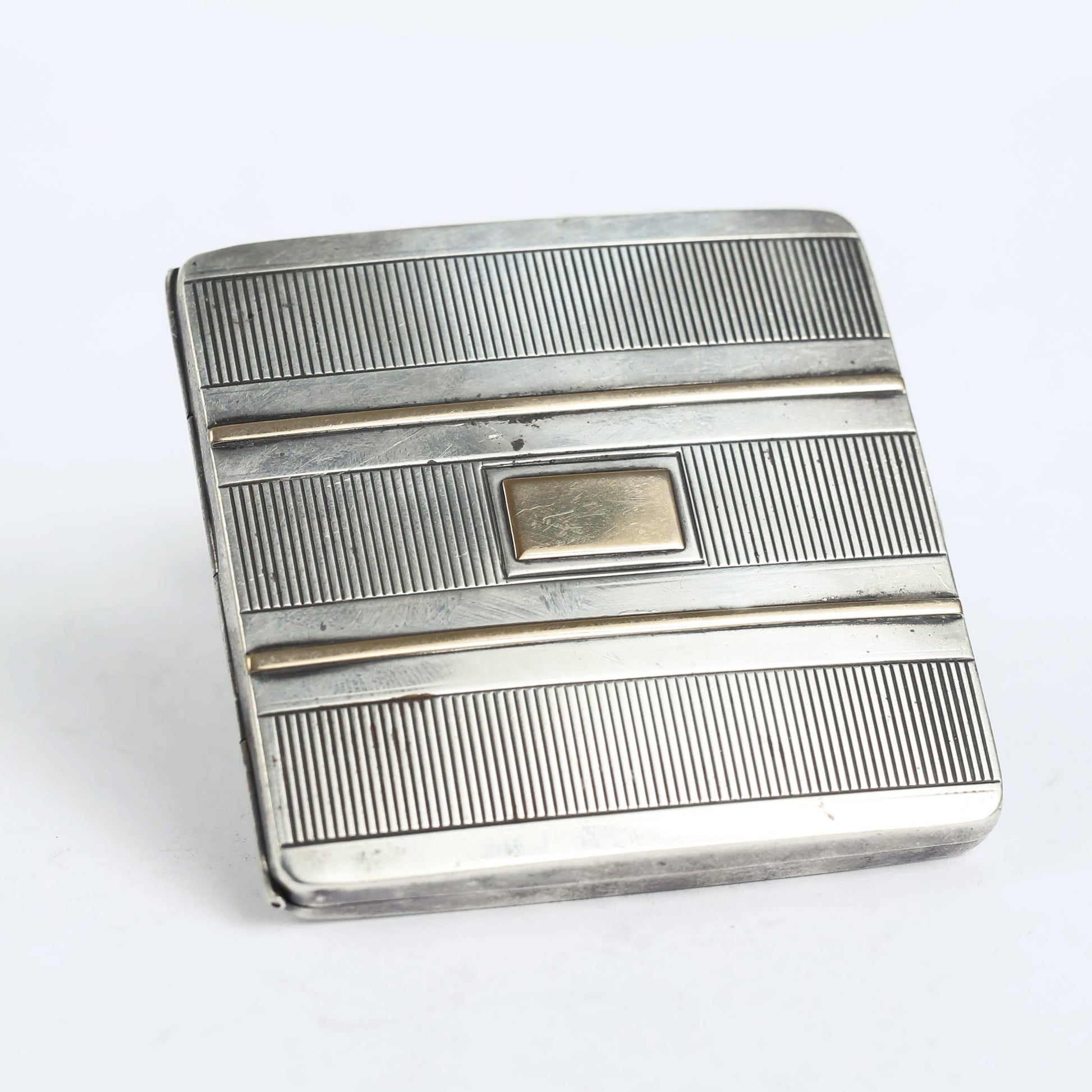 This cigarette box, designed in an English style of the 1920'-1930', is made of silver and 14 carat of gold.
