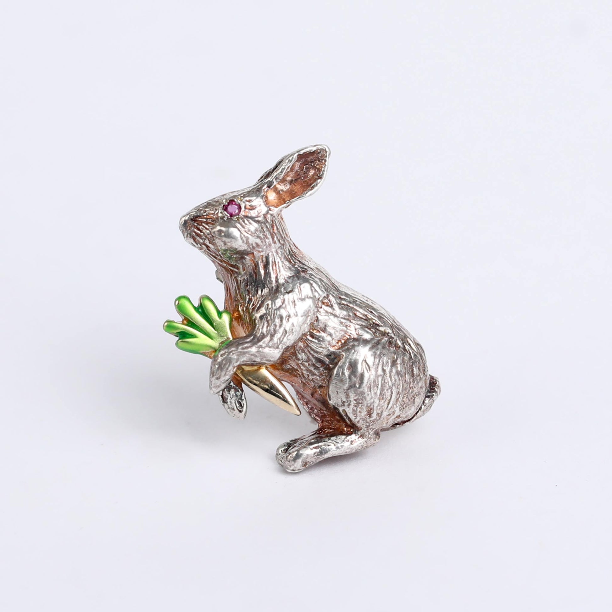 one-of-a-kind Handcrafted Bunny Pin with carrot , made from pure silver 925.  the carrot made from gold. This sweet brooch adds grace and style to any look, with its adorable design and meticulous craftsmanship. Elevate your ensemble effortlessly with this timeless accessory that embodies both charm and elegance.