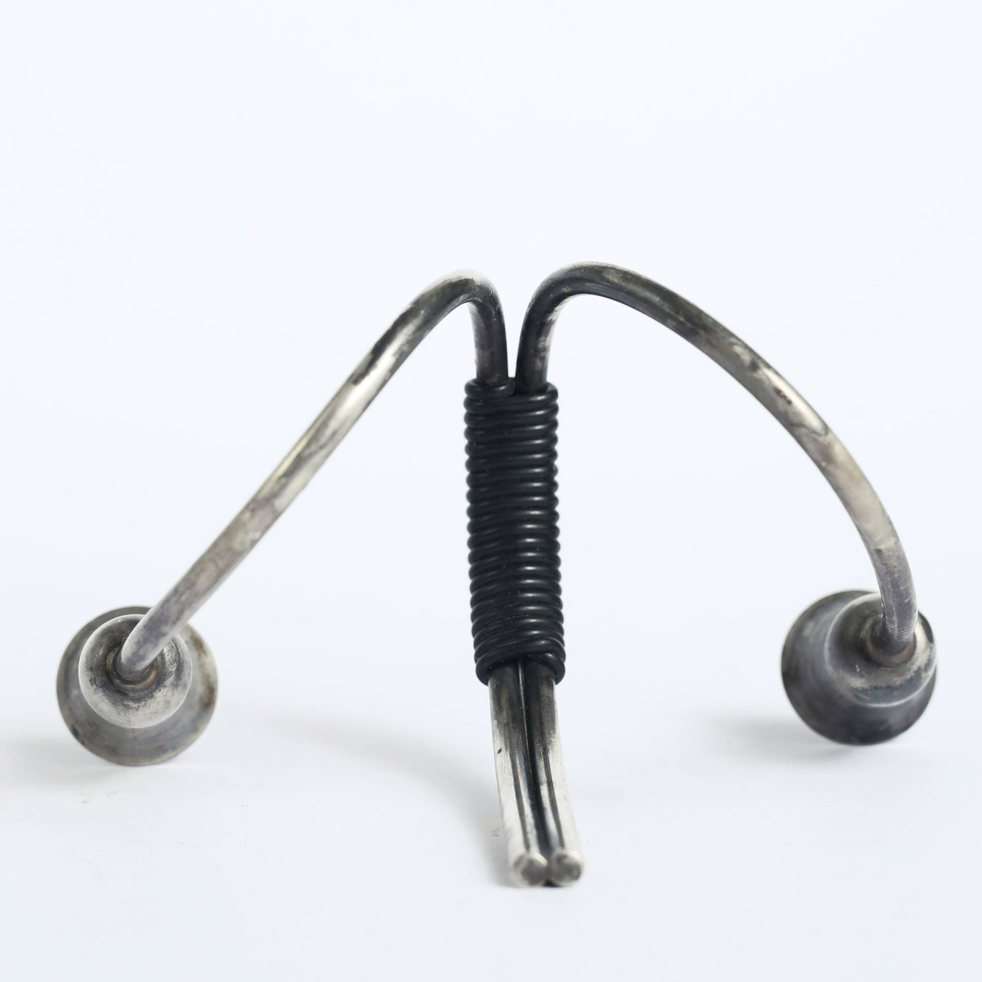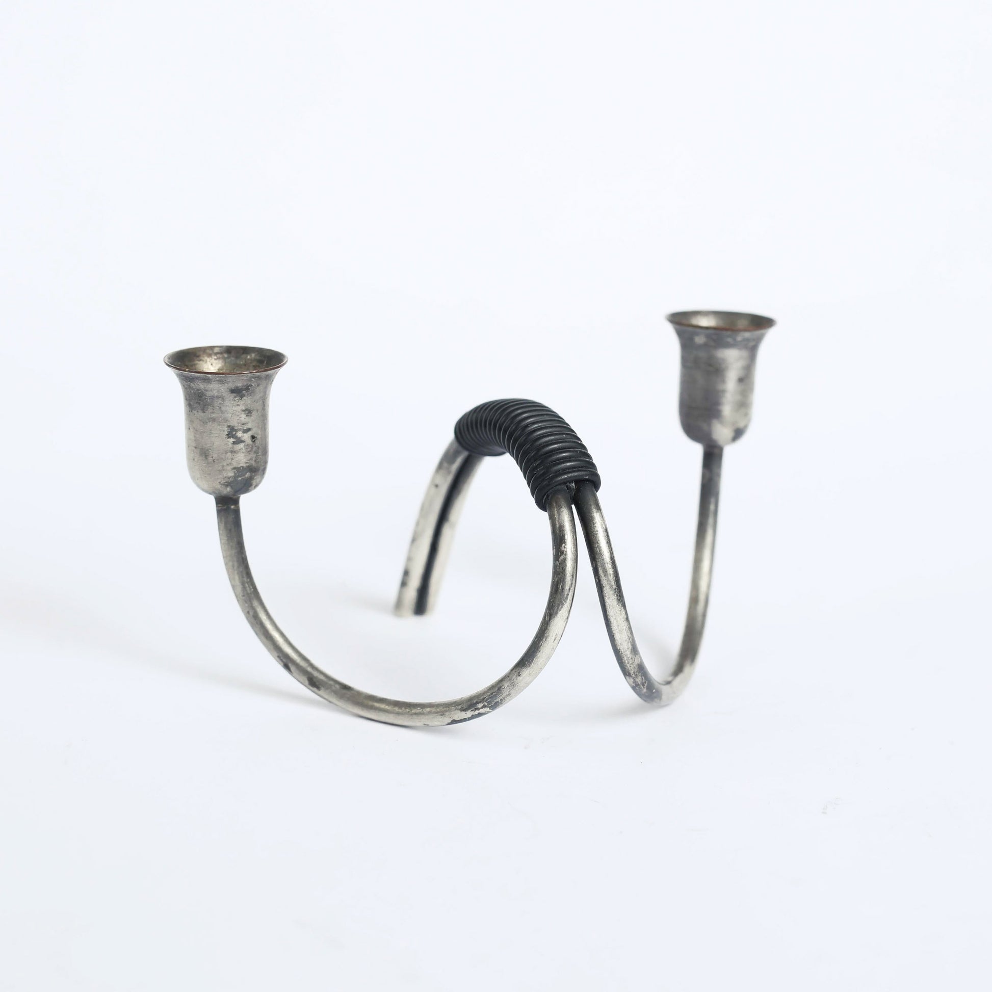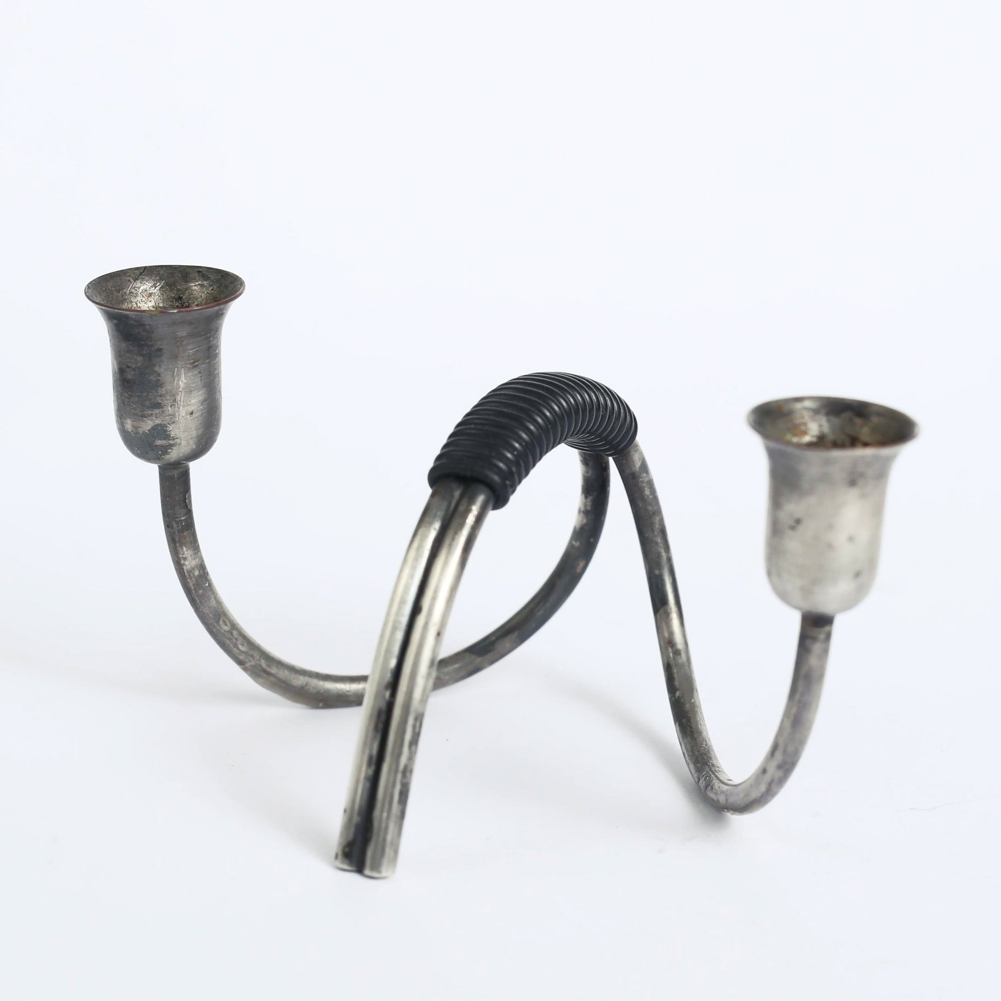 A real silver candle holder, made in Denmark and signed by the artist. Made of two candleholders are intwined by black strips.