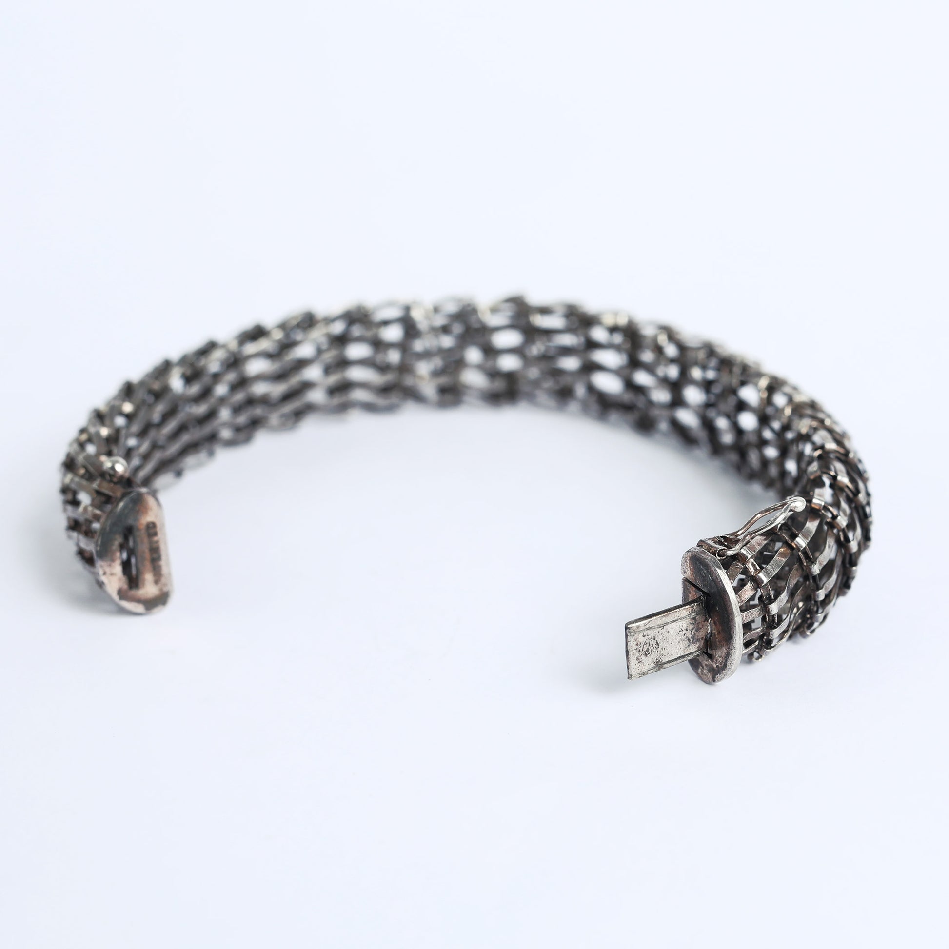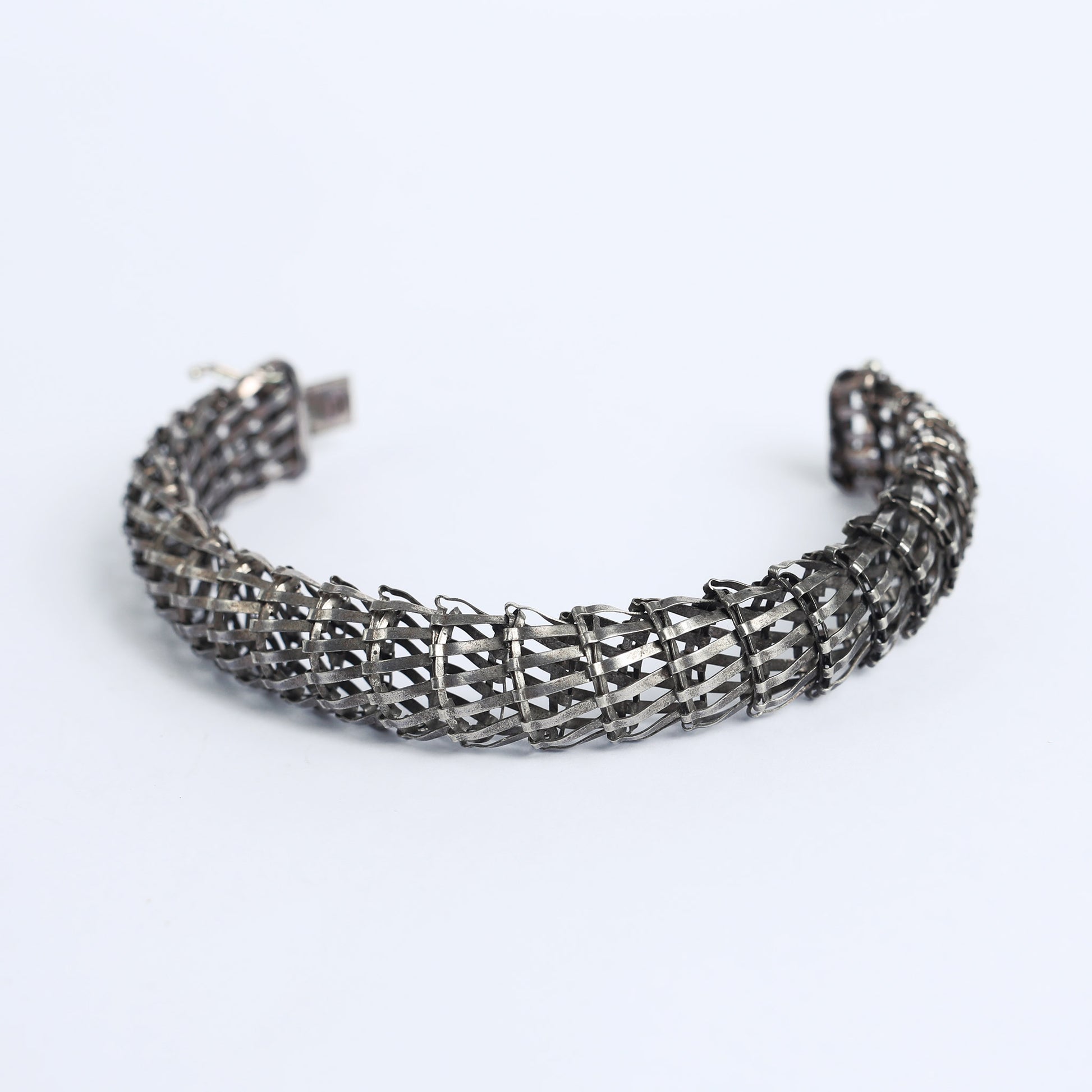 A silver bracelet shaped like a spring. Though it seems massive and heavy, it is actually very light to wear.