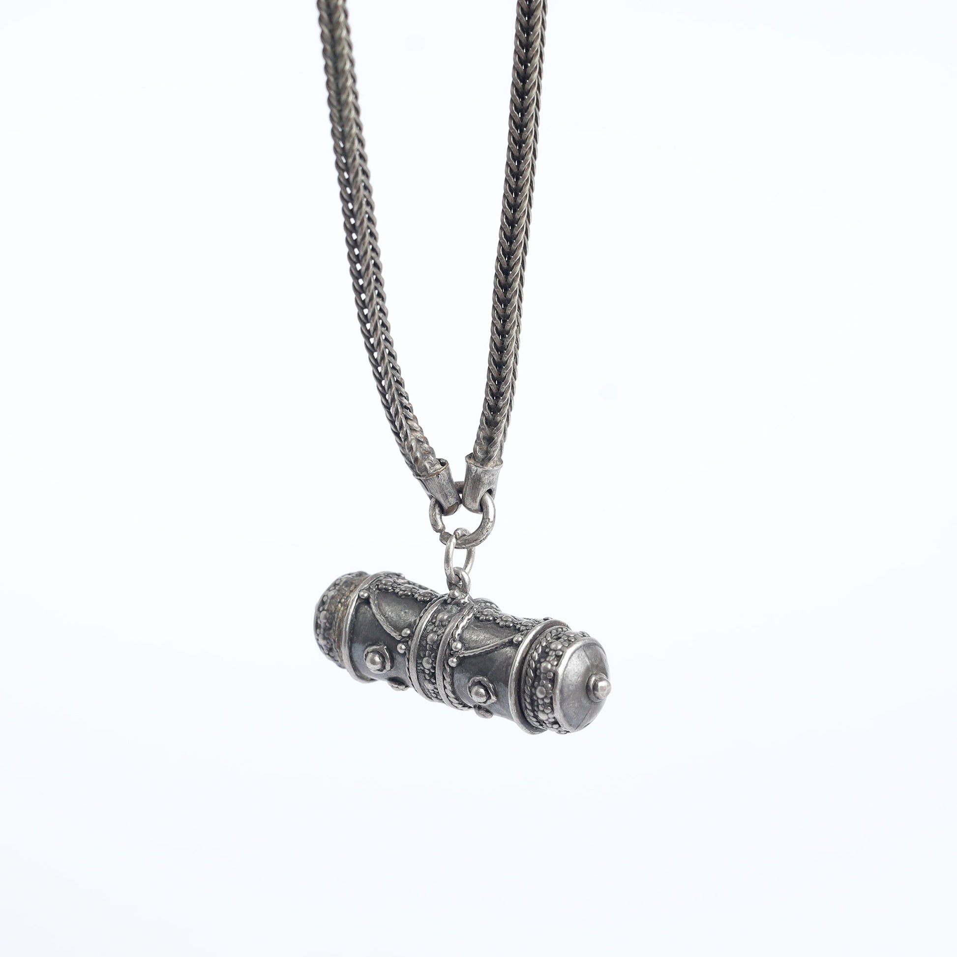 A silver, sealed amulet neckalce. Never open, the original amulet might be still inside. Usually found in amulets are card with blessings to keep the owner wearing them from harms way, evil spirits and evil eyes. The design is of traditional Jewish amulets, but without knowing in which language or what symbols are inscribed on the amulet itself, it could be from anywhere in the world. the 925 Sterling silver signature suggest it might be from Europe.