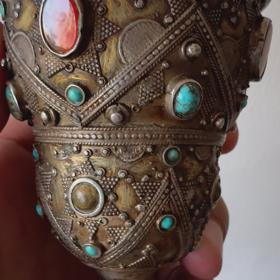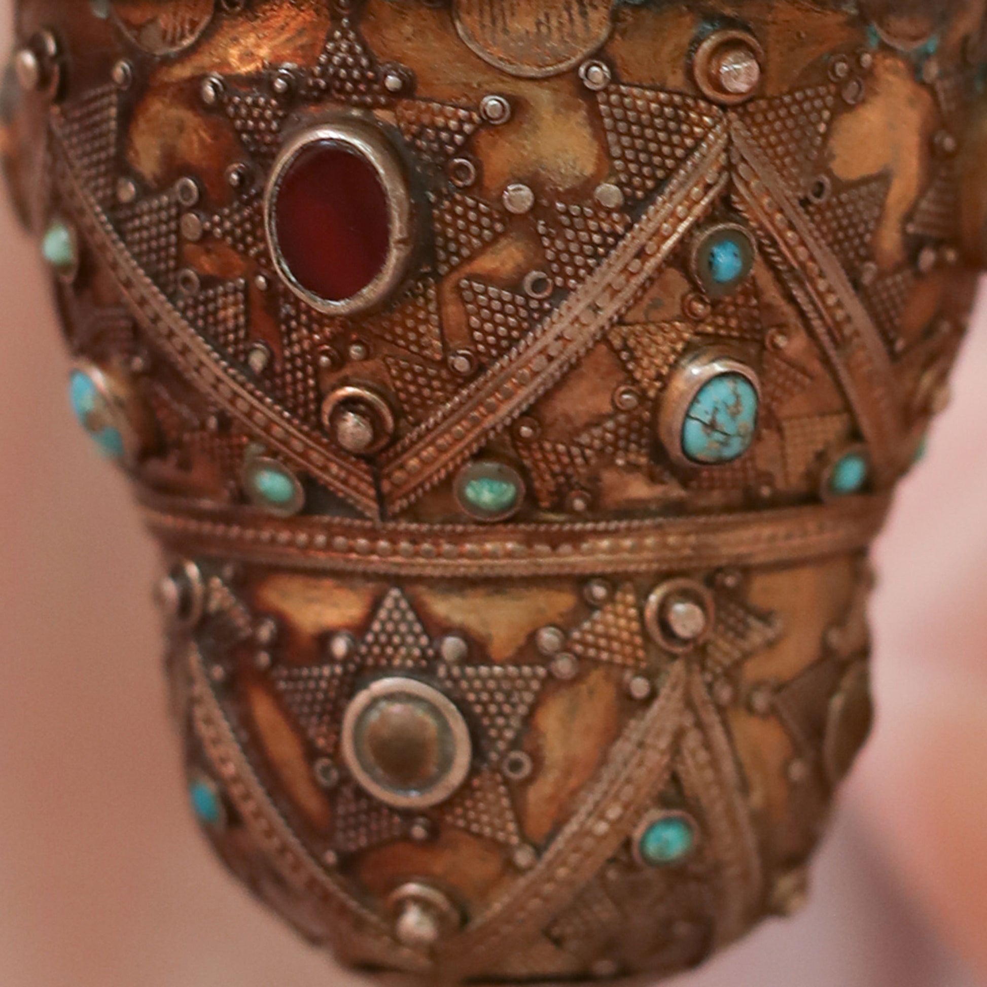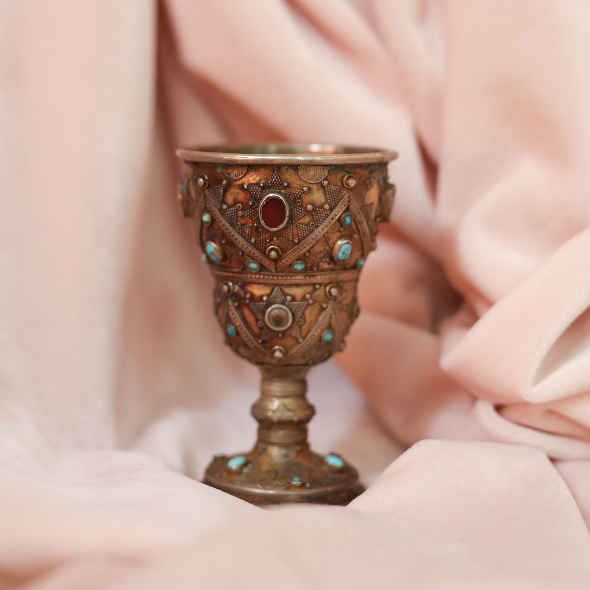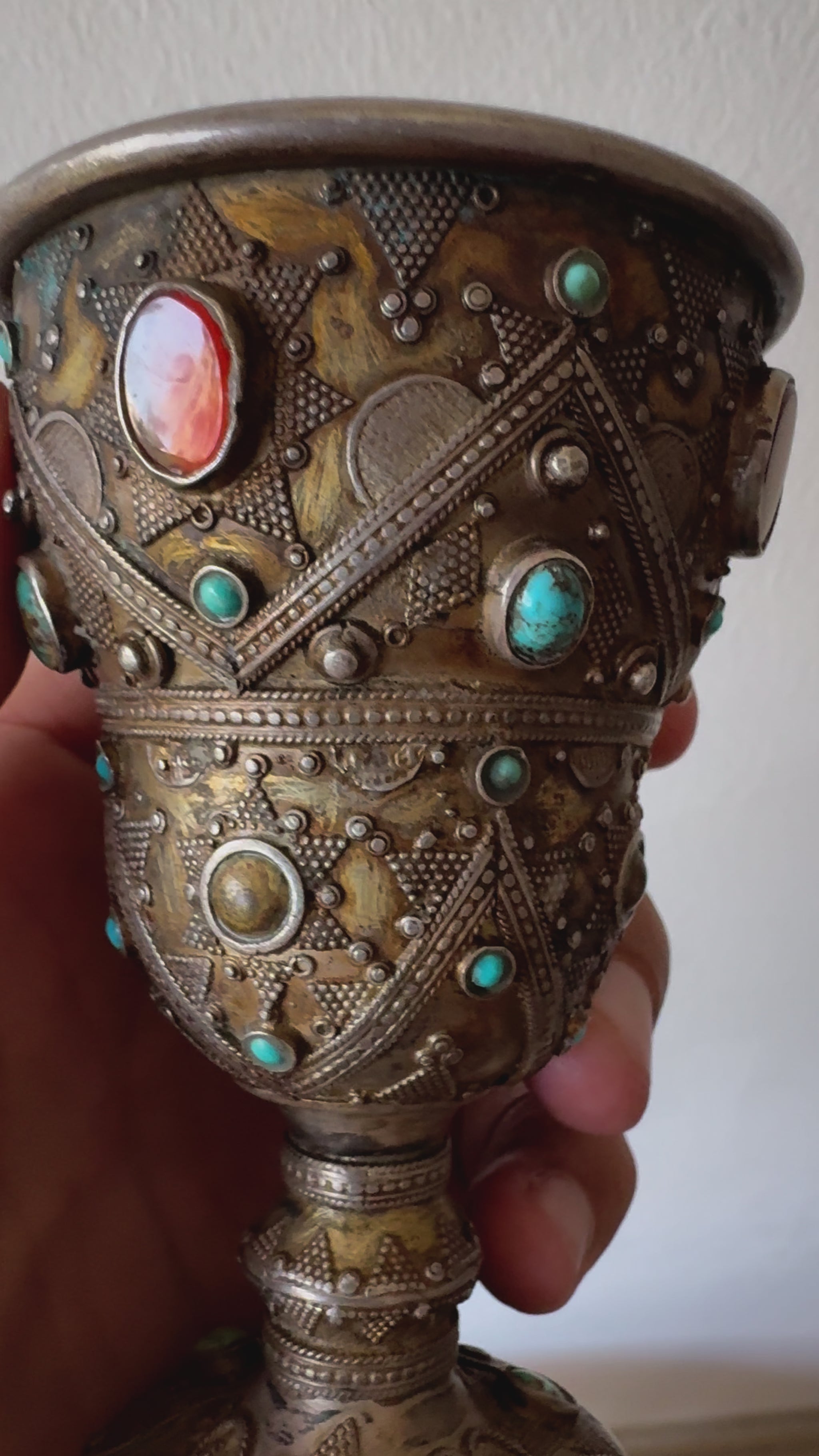 Made from a blend of silver mixed with copper and adorned with real gems, these glasses are a testament to the craftsmanship and artistry of generations past. Each gemstone, from the Iranian turquoise to the cornelian, holds its own story and symbolism, adding depth and beauty to the piece.