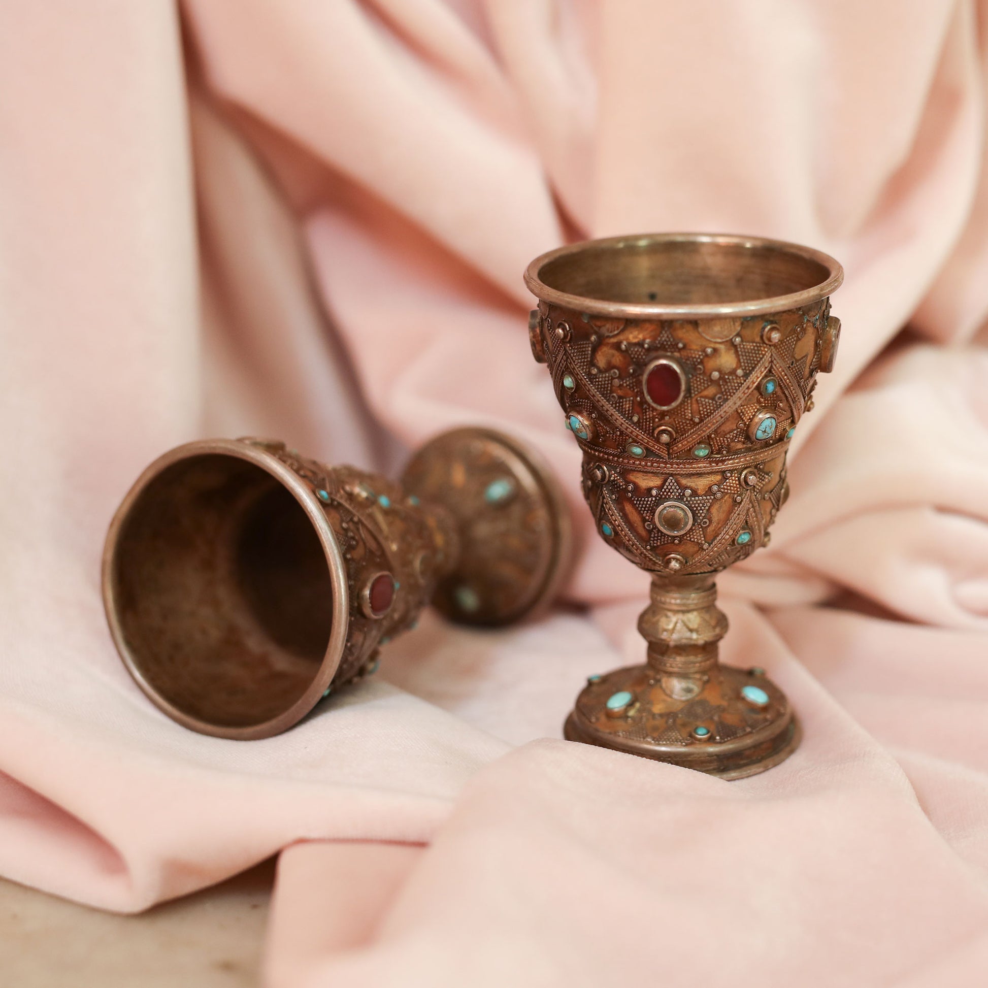Step into a world of cultural richness and heritage with our Antique Turkmen Wedding Glasses, a treasure steeped in tradition and significance. Crafted over a century ago, these glasses were once bestowed upon the bride and groom of the Turkmen tribe on their wedding day, symbolizing love, prosperity, and enduring union.