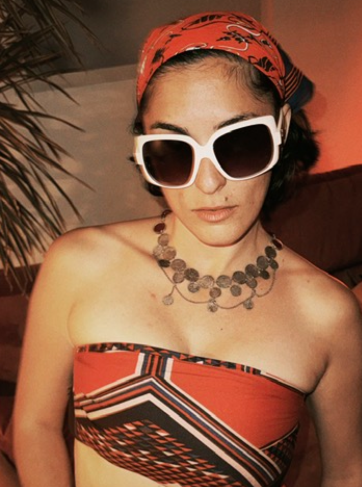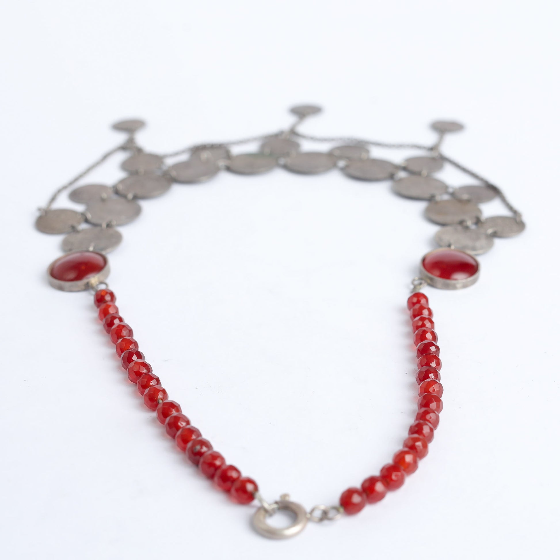 A giant garment, made of silver and original Arab coins, with Arab calligraphy. The stones are real cornelian gems. Carnelian is known as a stone bringing warmth, strength, courage and creativity, healing properties both emotional and physical.