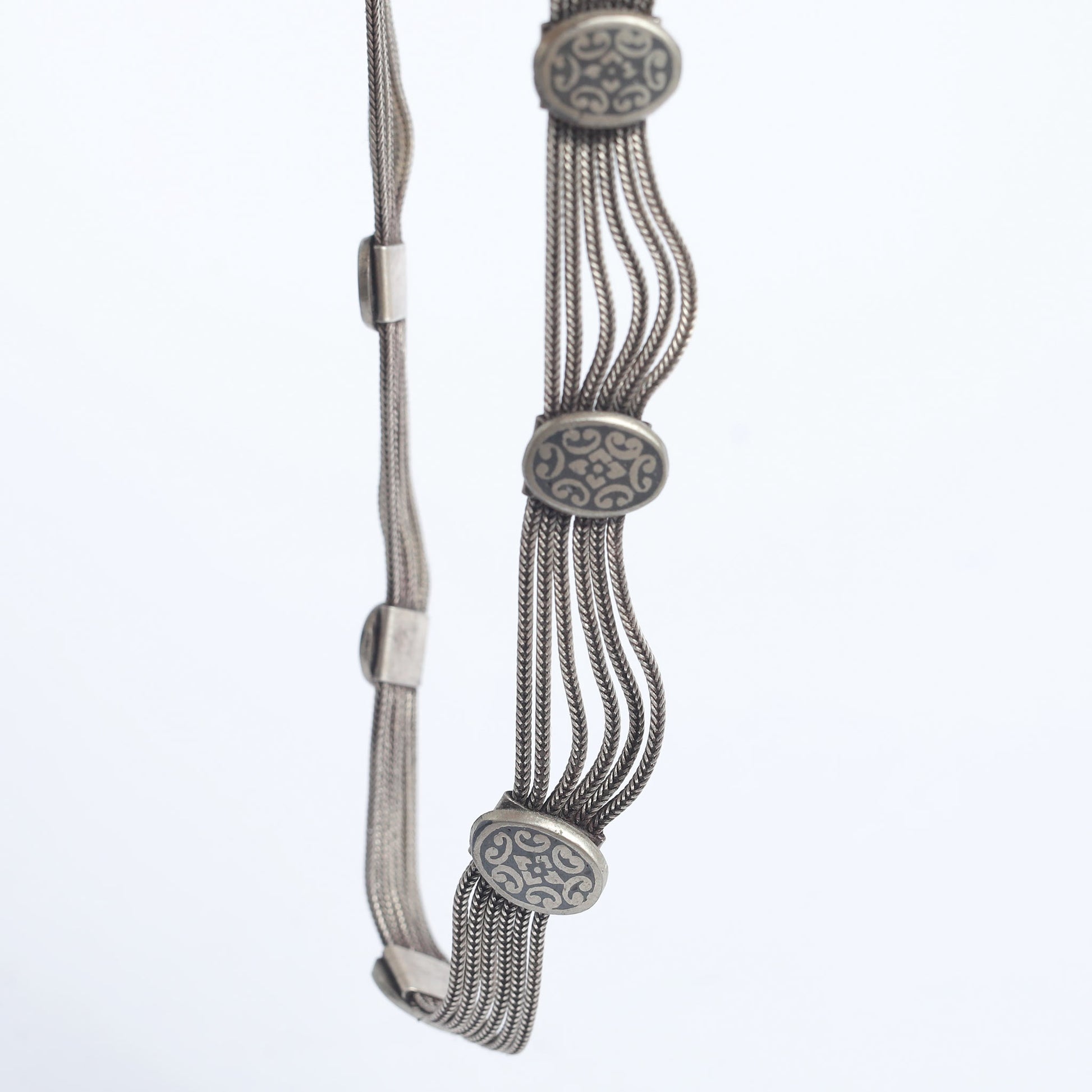 Brought from one of the countries of the Balkan region, this massive, hand- made, antique necklace, made from silver and partially covered with black enamel, is designed for wealthy women as a symbol of social status.