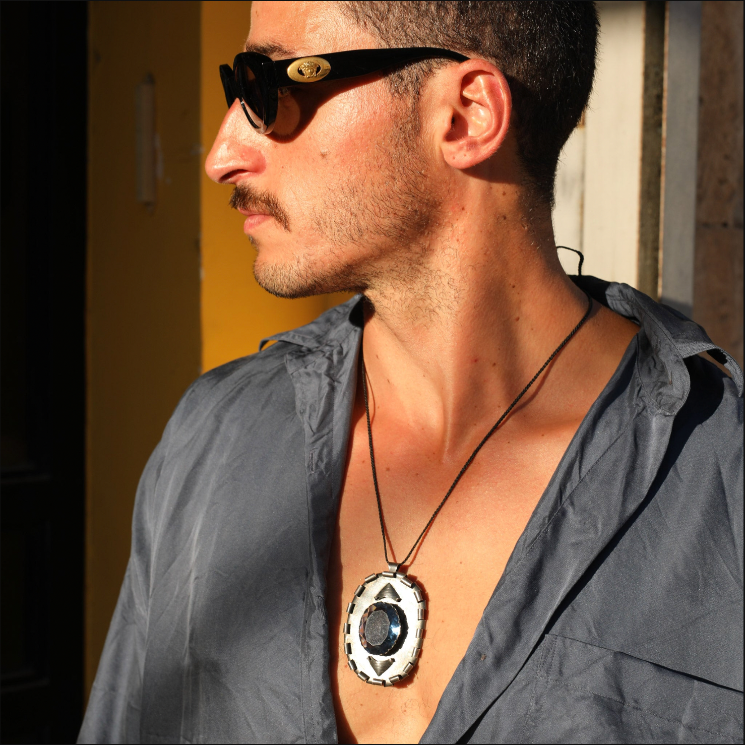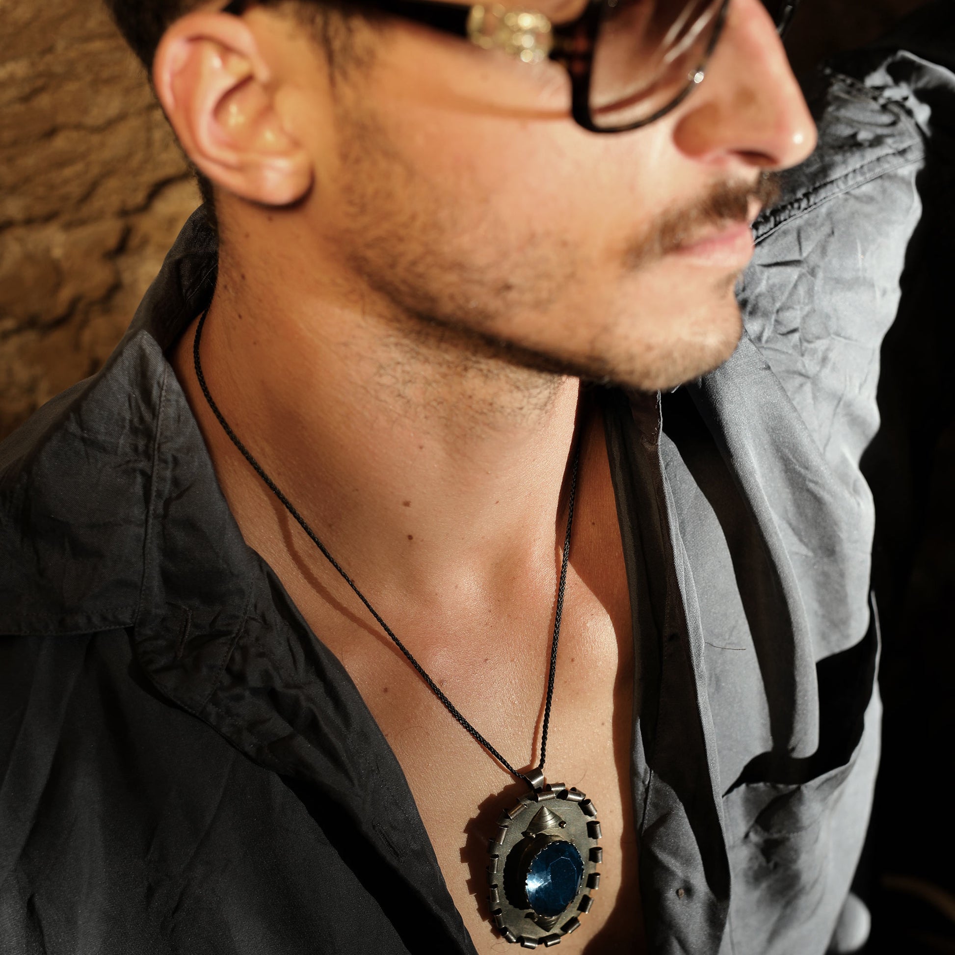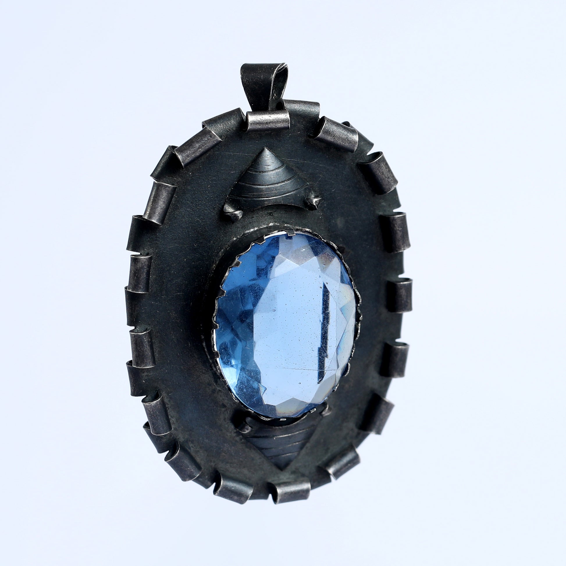 This piece is both a decorative pin and a pendant, influenced by the brutalist jewelry design, made of iron and a diamond- cut glass. In brutalist jewelry, the use of material is massive and the forms are abstract, creating an intense and expressive piece.