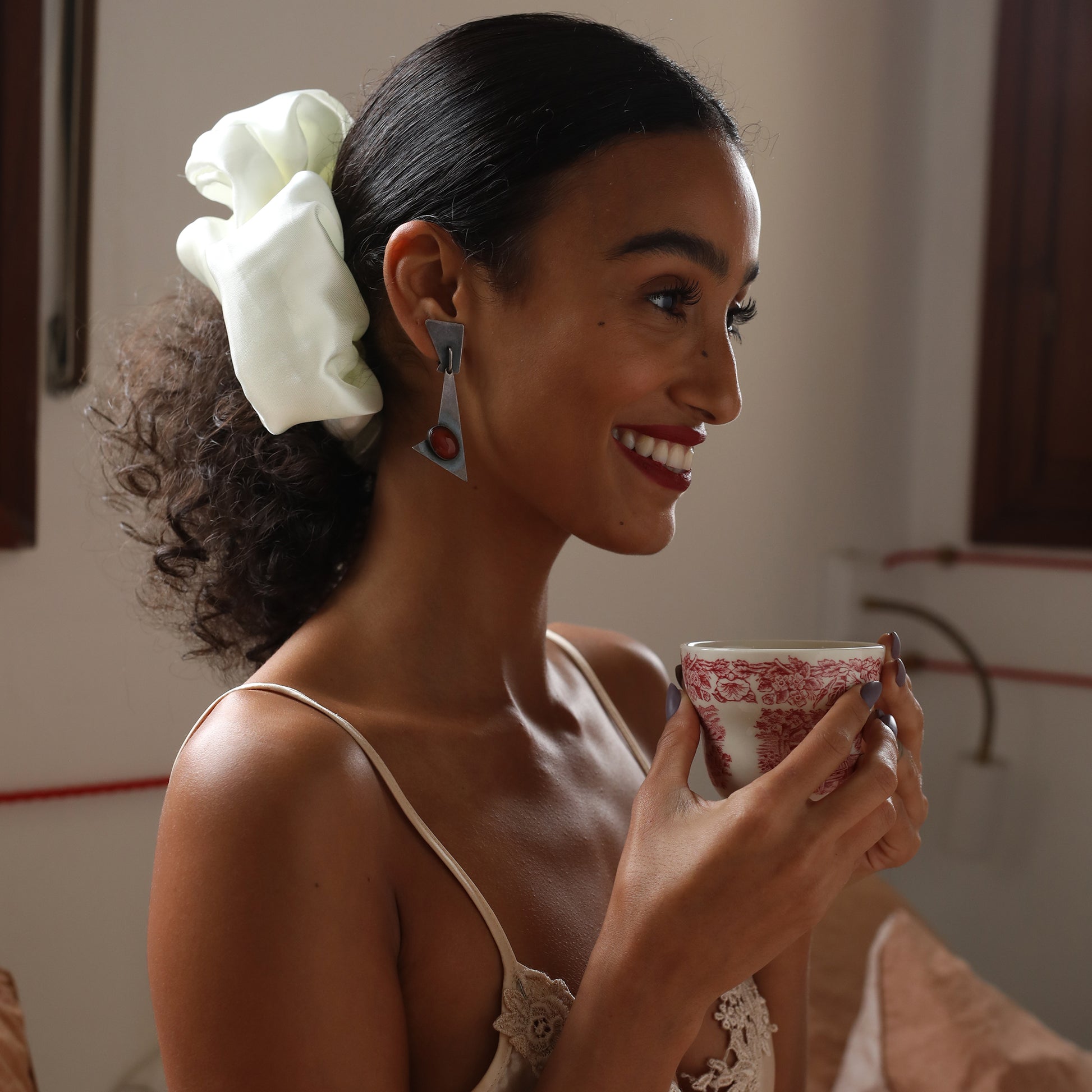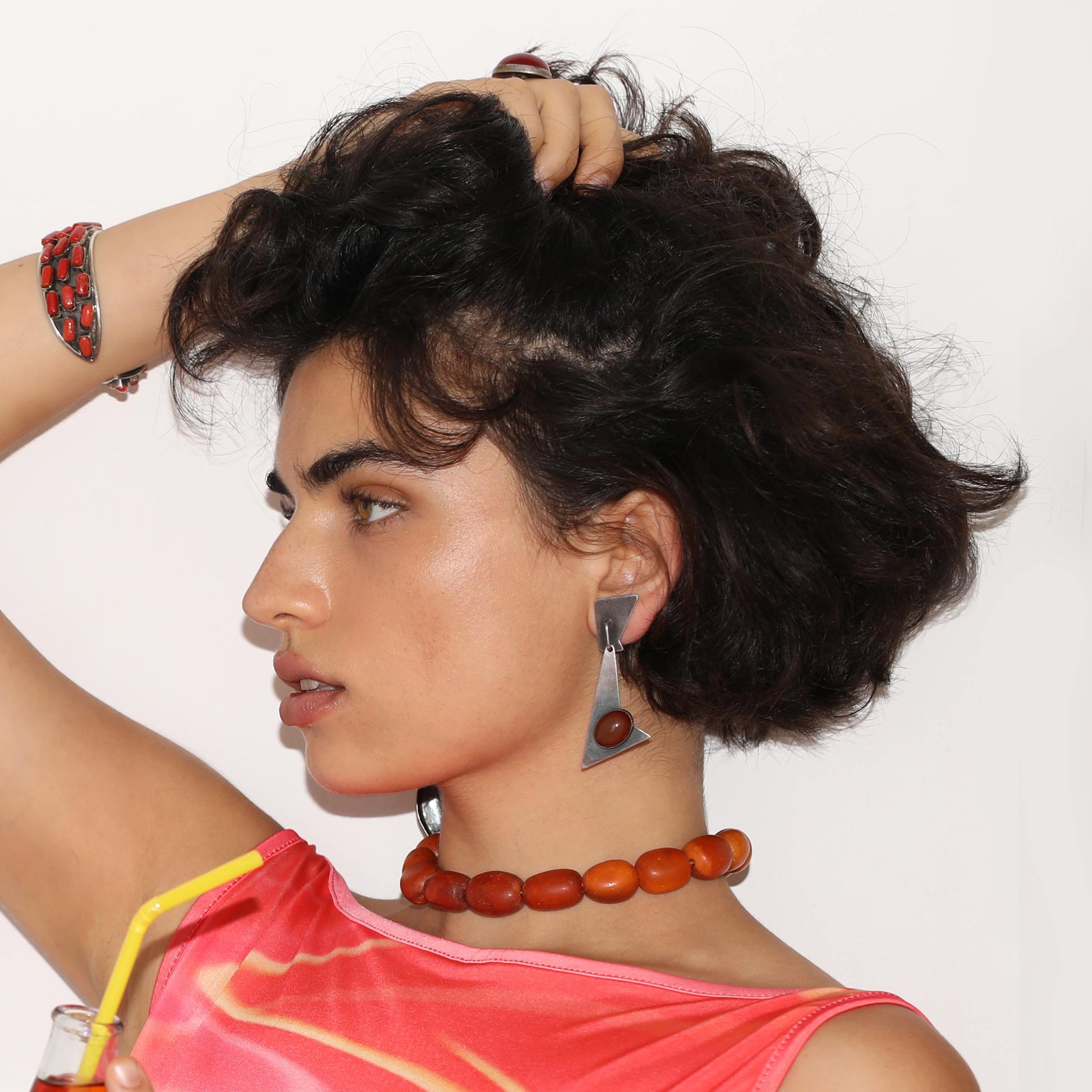 A pair of silver earrings embedded with cornelian stone. Cornelian is a semi- precious gemstone, highly valued since ancient times in regions like Assyria and Greece. It is one of the stones thought to be the Odem, one of the twelve stones found on the Hoshen, the sacred garment worn by the High priest of the Temple of Jerusalem. These earrings were made in the 1950’s in Israel.