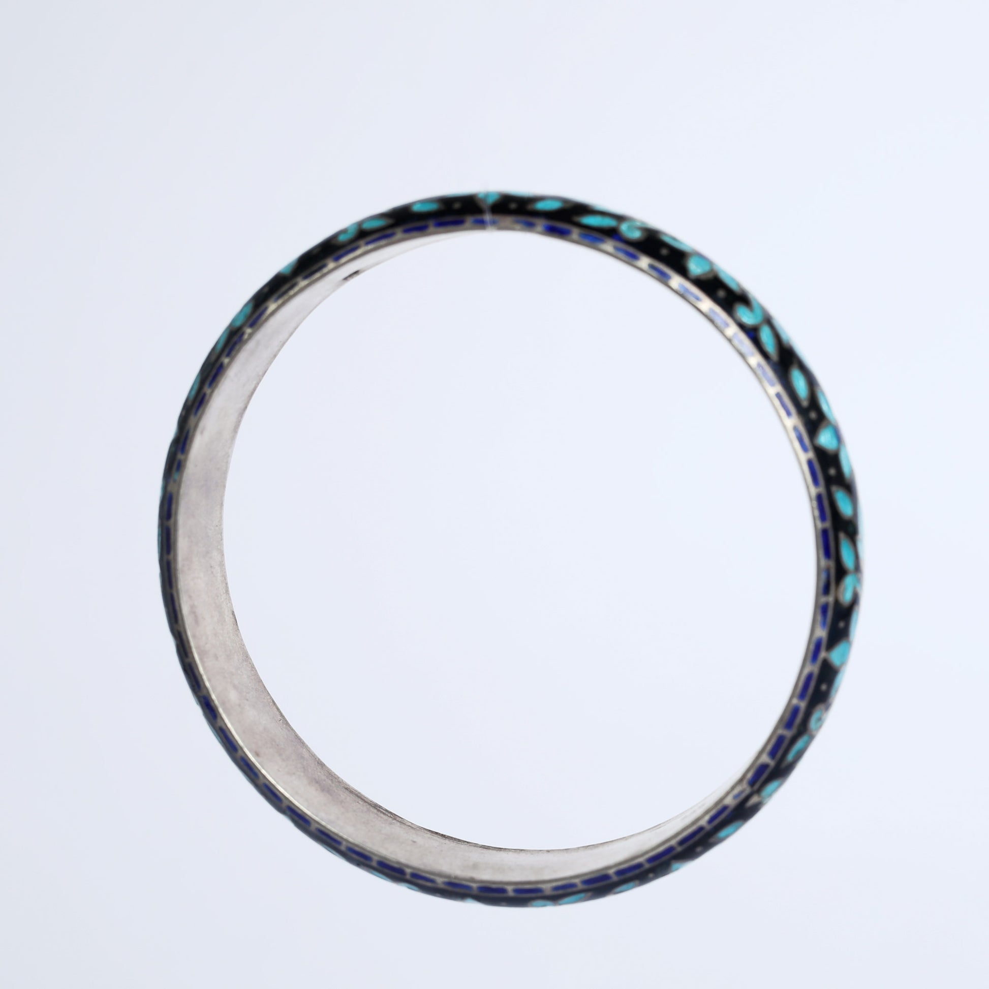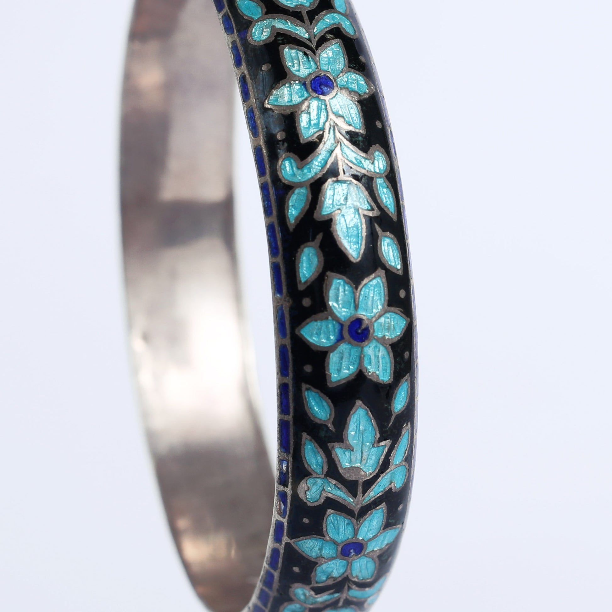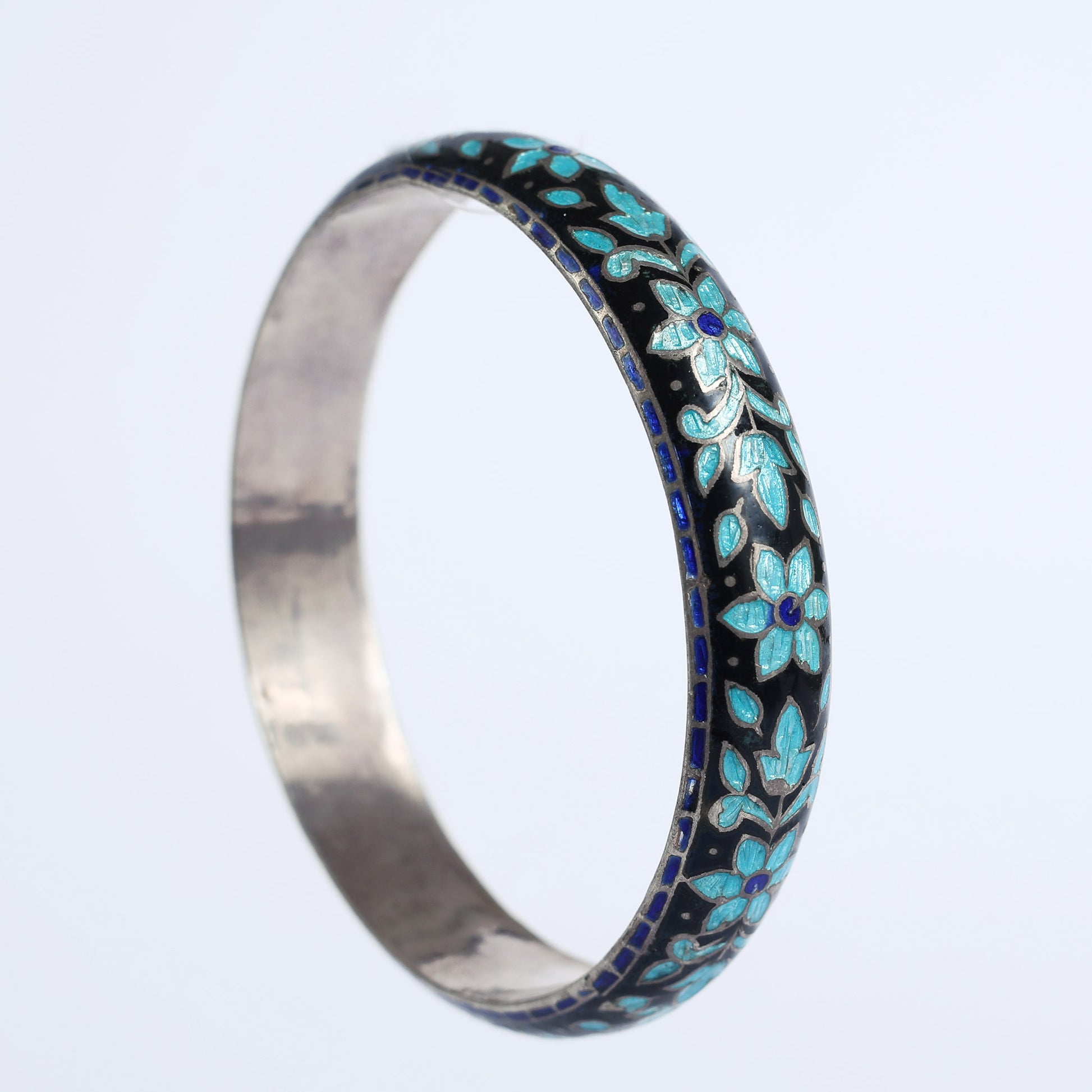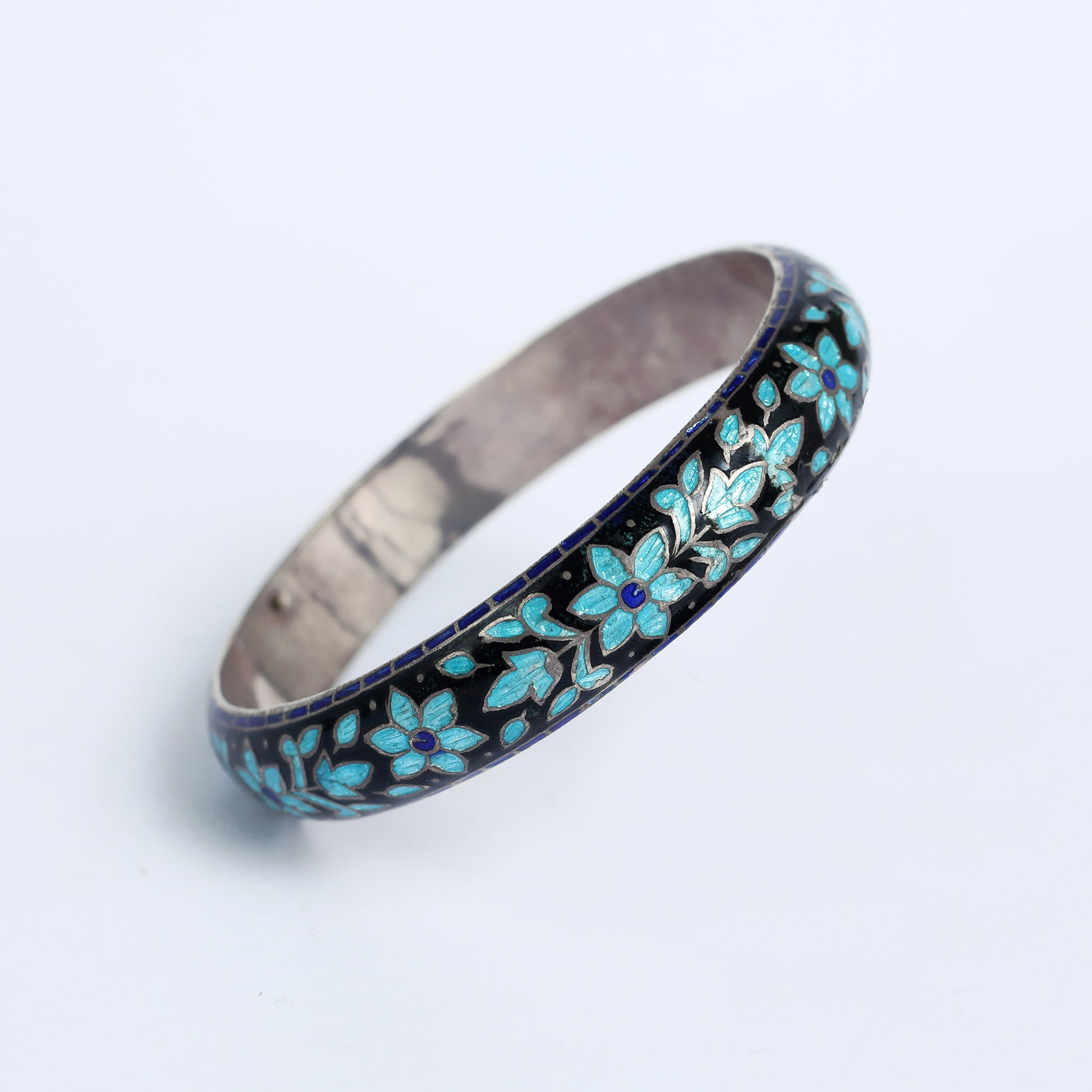 An silver bracelet with a Chinese enamel patterns. Enamel is the name of the semi-transparent glossy substance that is a type of glass, applied by vitrification to metallic or other hard surfaces for ornament or as a protective coating, a jewelry technique used by jewelry makers throughout history.