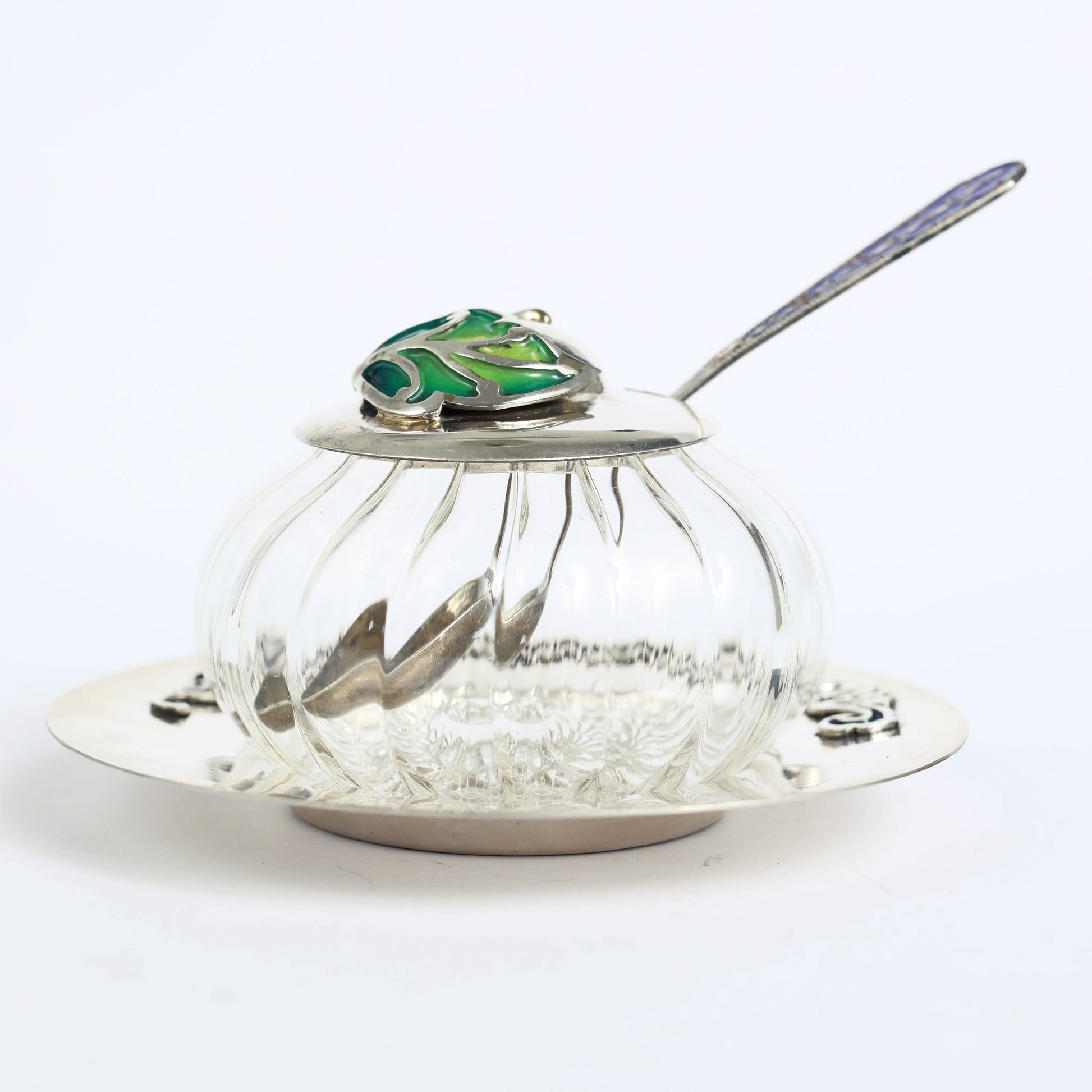 A silver, enamel and glass bowl, made in Israel. It is designed to put honey in for the celebration of the Jewish new years eve- Rosh Hashana. The writing in Hebrew says "May it will be a sweet and good year", corresponds with the tradition to eat an apple dipped in honey that symbolises sweetness. Enamel is the name of the opaque glossy substance that is a type of glass, applied by vitrification to metallic or other hard surfaces for ornament or as a protective coating, a technique used by jewelry throughout history.