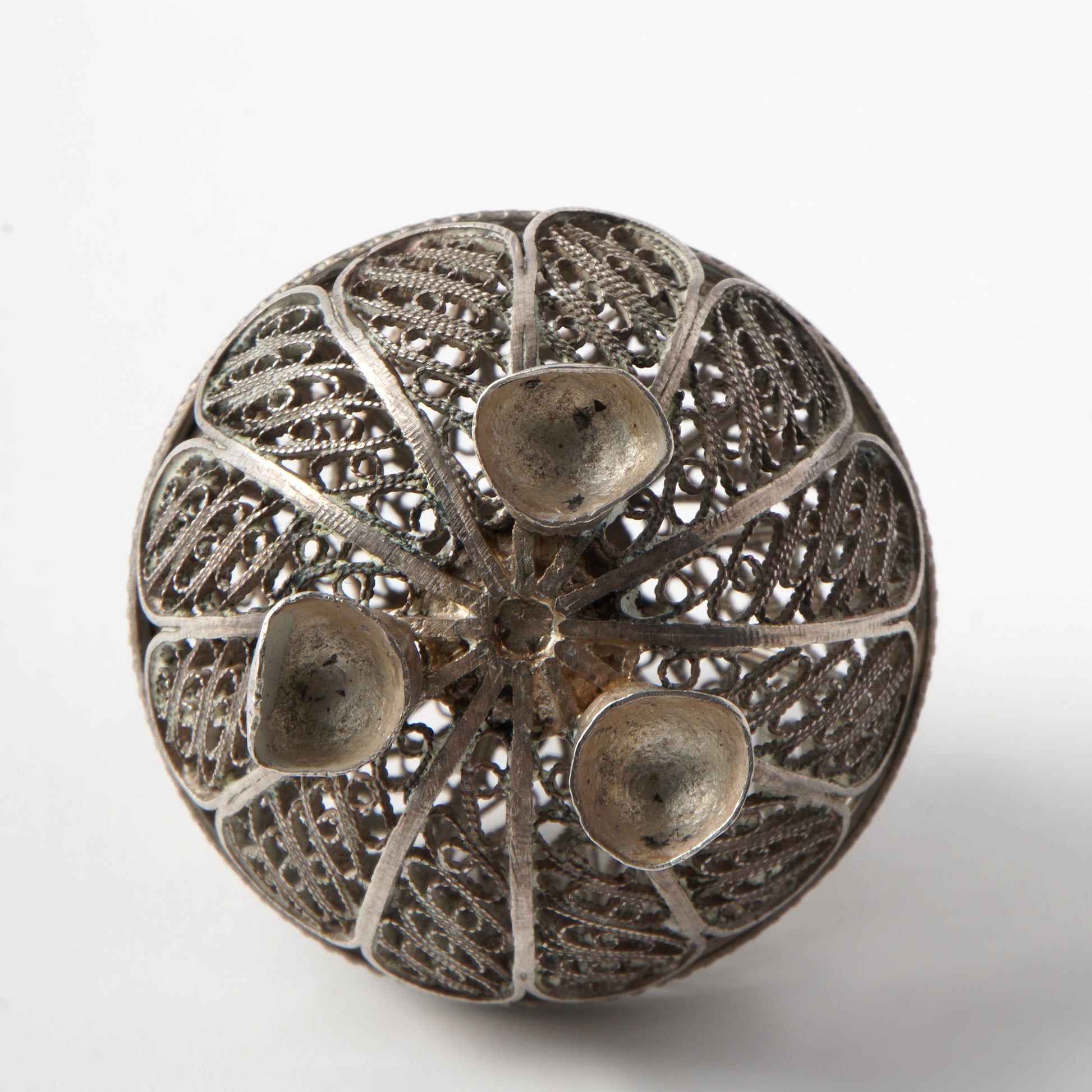 This is a Filigree designed jewelry or perfumery box, made of pure silver. Filigree is the name of the technique of intricate metal used to form this piece. In the last few centuries, it was more of common use in the Iberian Peninsula and is influenced from the Moor and Spanish ornaments.
