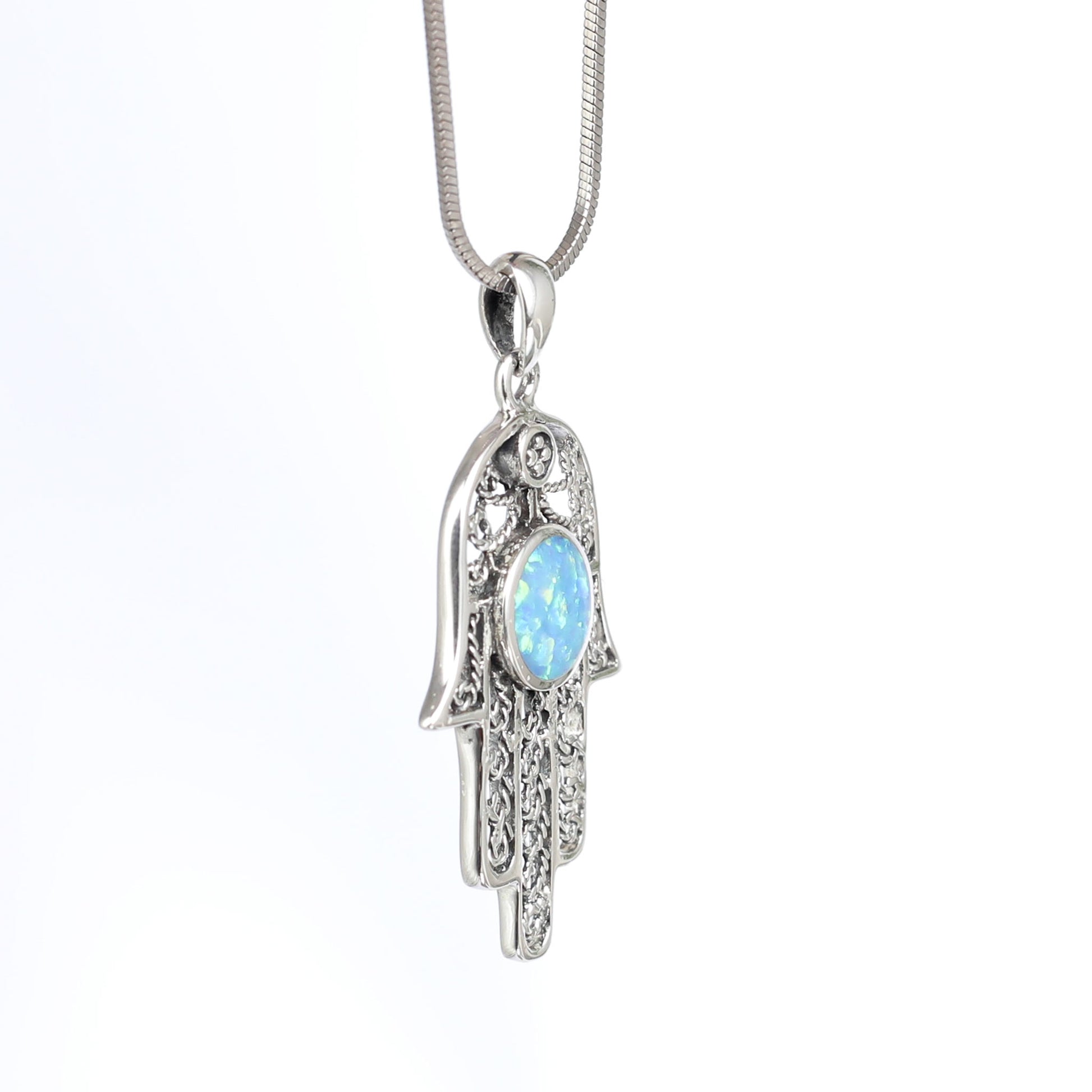 Embrace a touch of serenity with our Sterling Silver Hamsa Necklace adorned with a tranquil turquoise stone. This beautifully crafted piece merges the protective energy of the Hamsa symbol with the calming essence of turquoise. The sterling silver chain adds a touch of elegance, making this necklace not only a symbol of spiritual protection but also a stylish accessory. Wear this Hamsa necklace as a meaningful and chic expression of faith and positive energy.