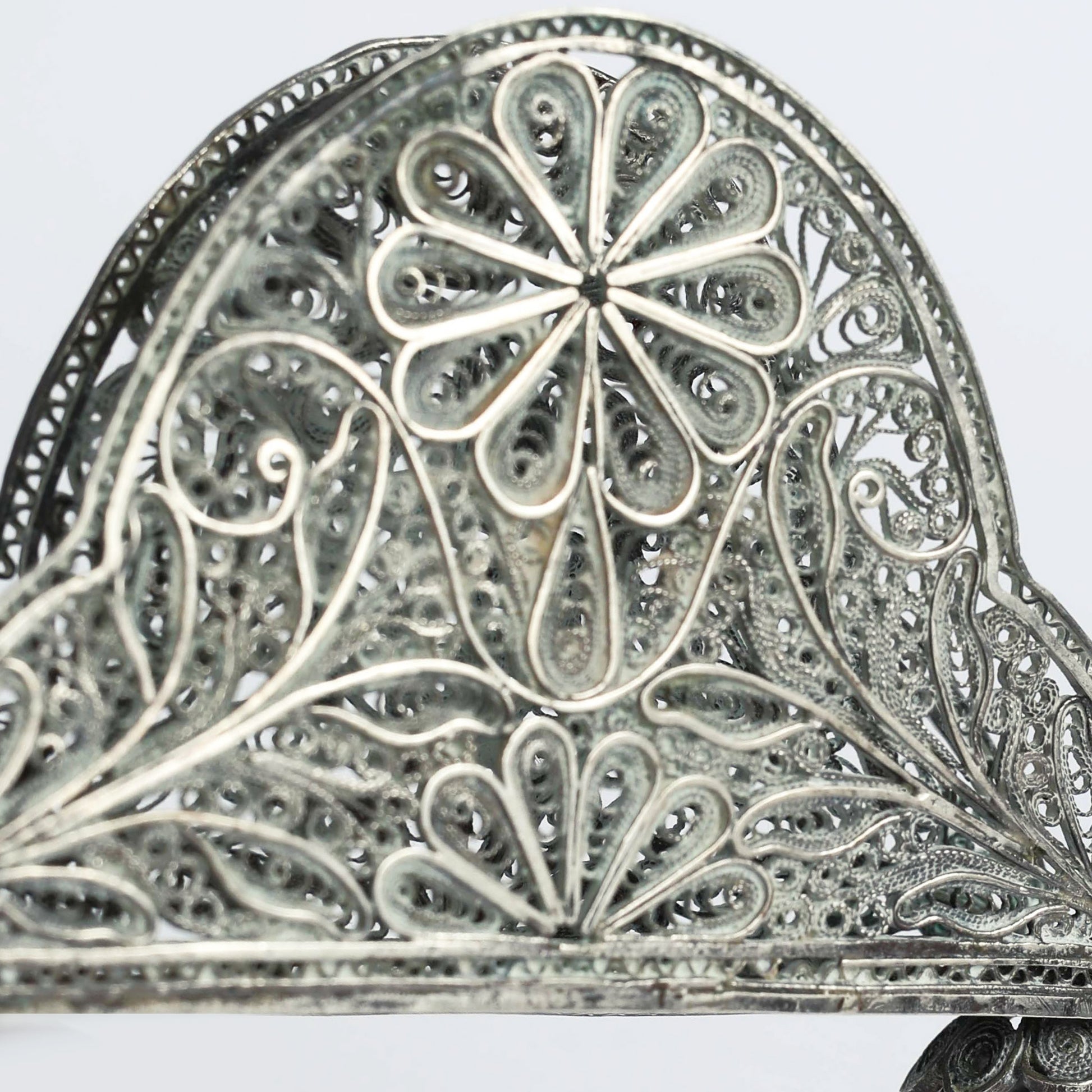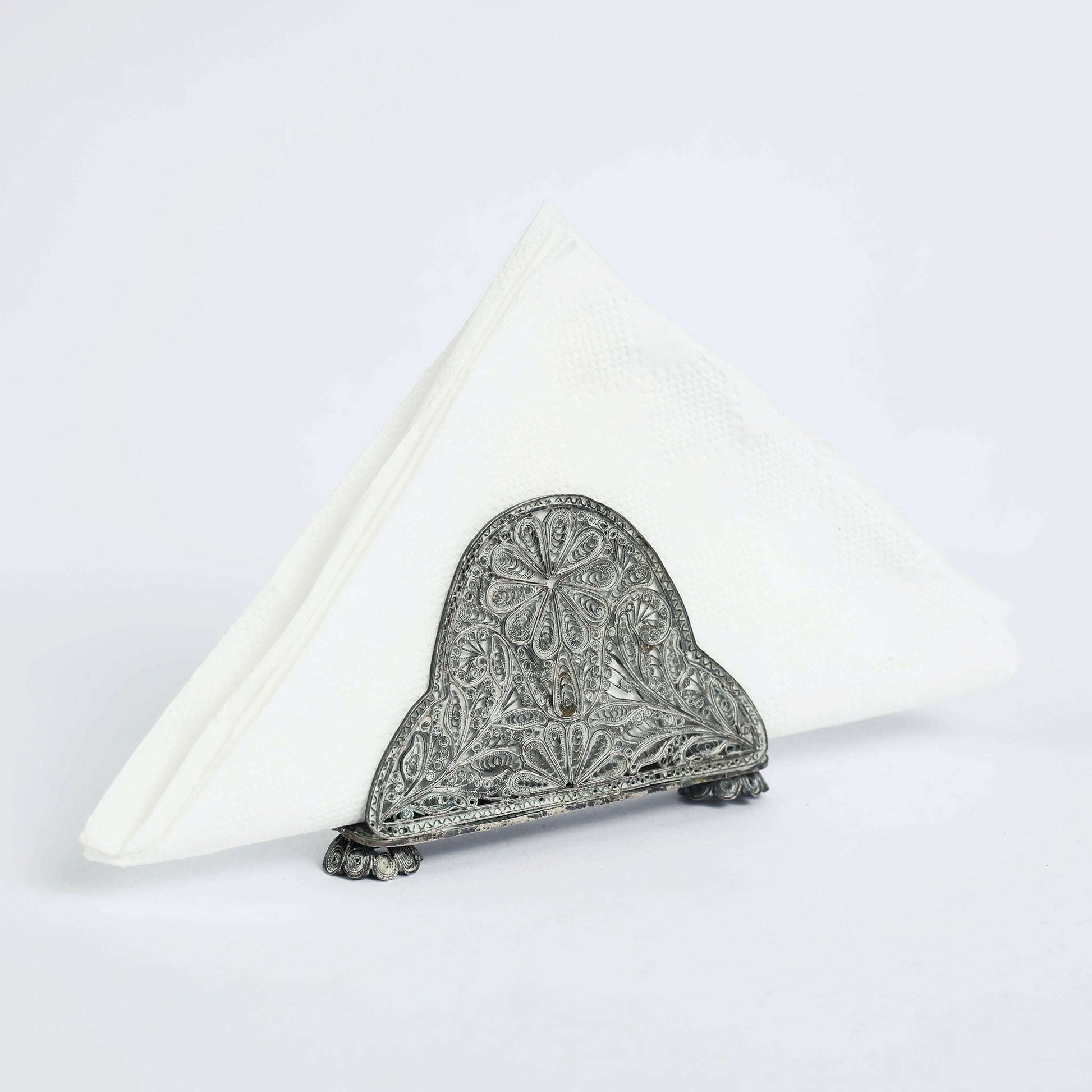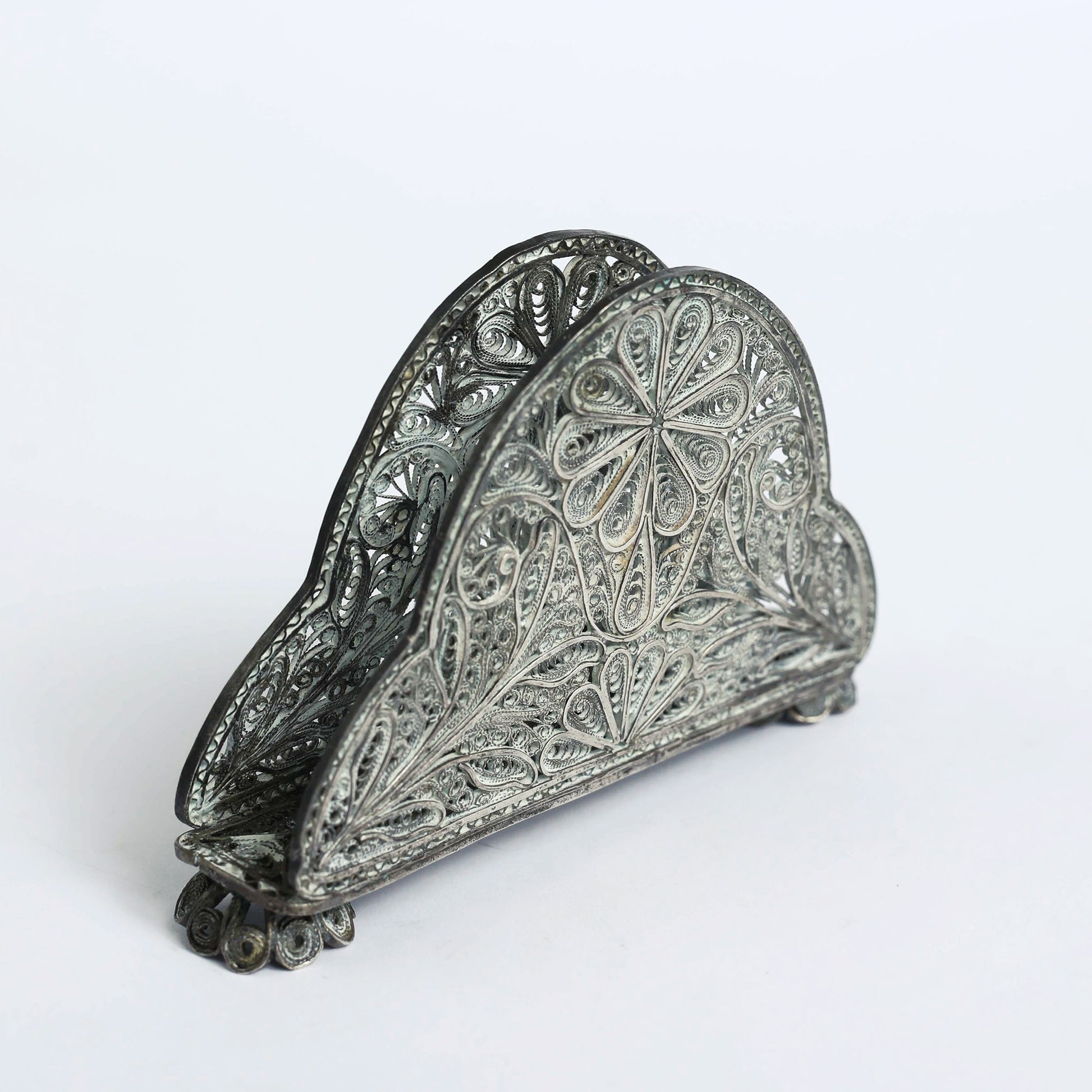 A silver napkin holder, with filigree flowers. Filigree, a known technique dating back to ancients times, is of intricate metals such as silver to form patterns such as flowers.