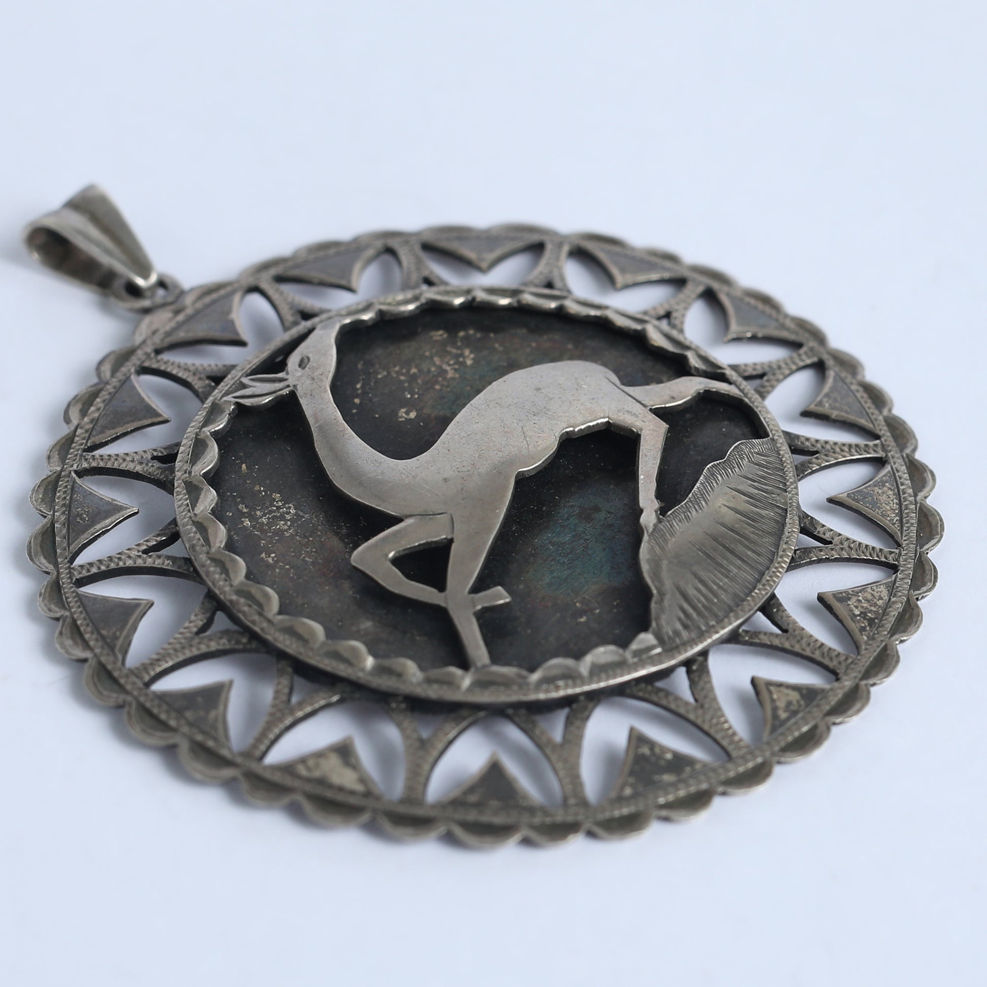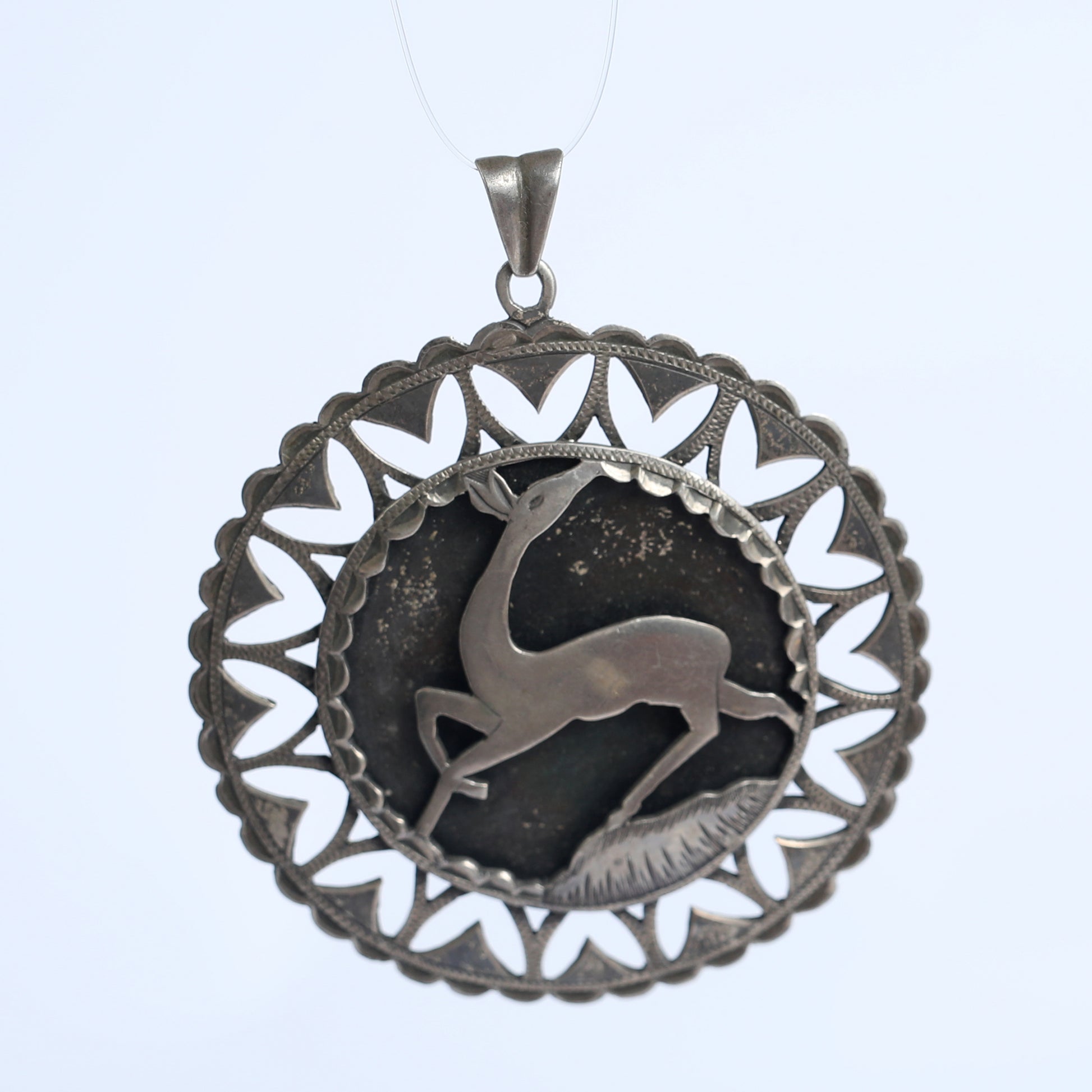 This is a handmade lavalier made of real silver, carved in Israel in the 1950’s, with a figure of a gazelle in its center. In the Song Of Songs, a romantic, sensual, and outmost holly text in Jewish culture, believed to be written by King Solomon, the gazelle is a representation and an image of pure beauty. This is a handmade lavalier made of real silver, carved in Israel in the 1950’s, with a figure of a gazelle in its center.