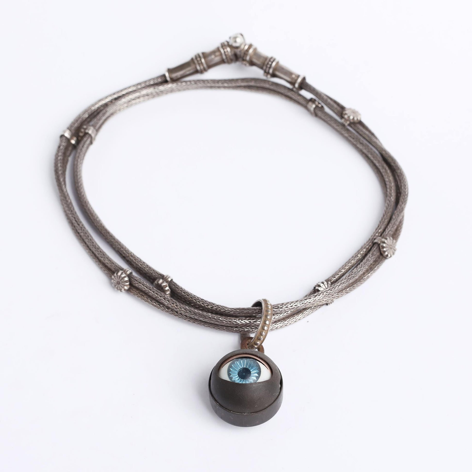 This one-of-a-kind necklace is a treasure in any jewelry collection, perfect for special occasions or as a captivating statement piece. Additionally, each purchase includes a special gift: an eye pendant, inspired by a fashion magazine photoshoot. Made from simple metal, this pendant adds a playful and mysterious charm to the wearer.