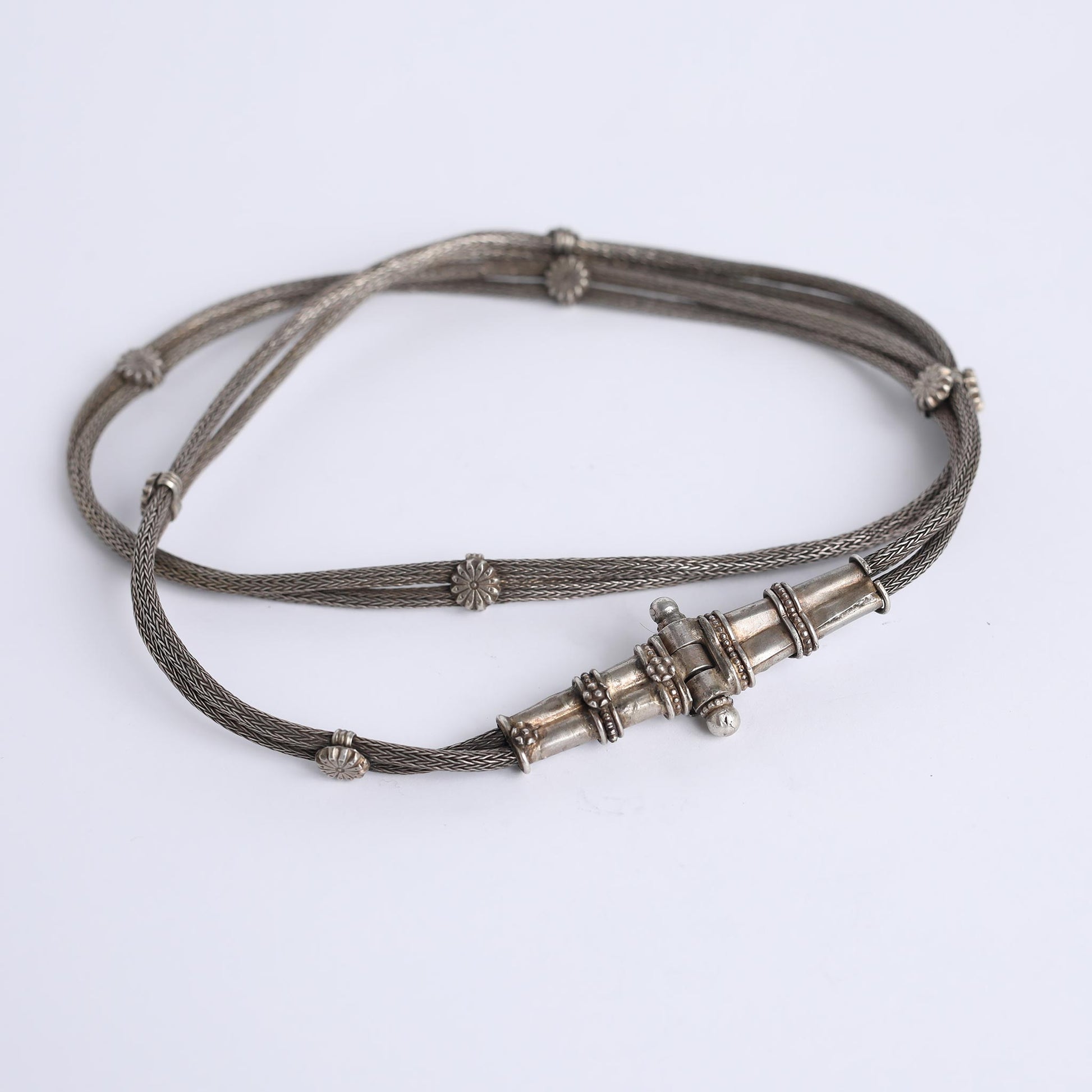 This necklace is adorned with delicate hand-placed silver flowers, radiating natural beauty and sophistication. Its versatile design allows it to be worn as a necklace, belt, or collar, seamlessly adding elegance to any outfit.