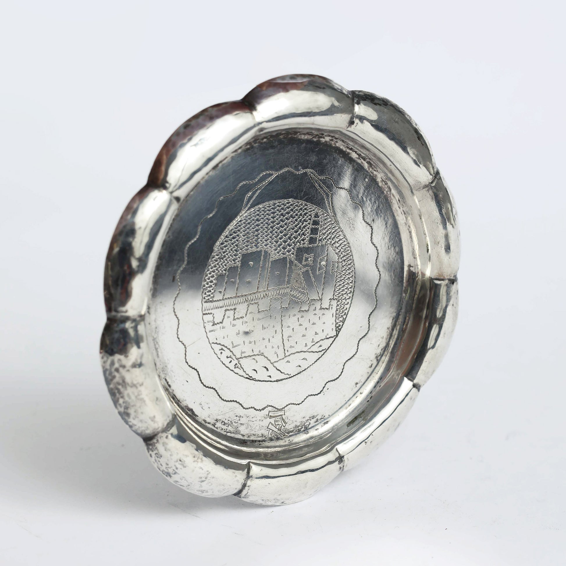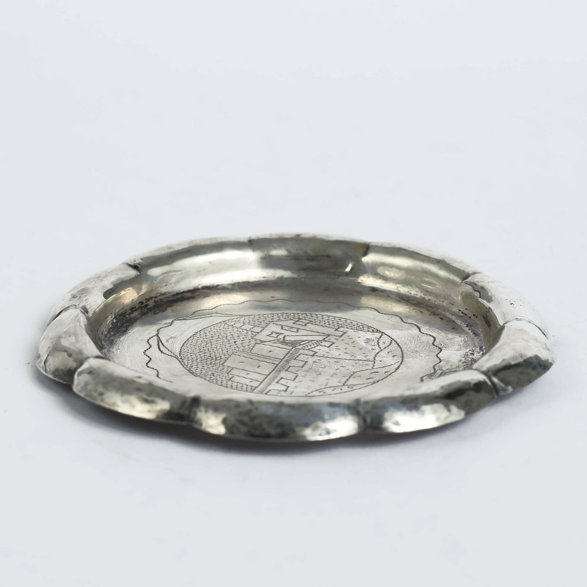 Influenced by the Italian design of silverware and Judaica, this is a Kiddush silver cup, made in Israel. The plate has the tower of David, found in Jerusalem and represents it mostly from the 1960's, making it a Kiddush cup that was probably intended to be sent to Jewish families all over the world.