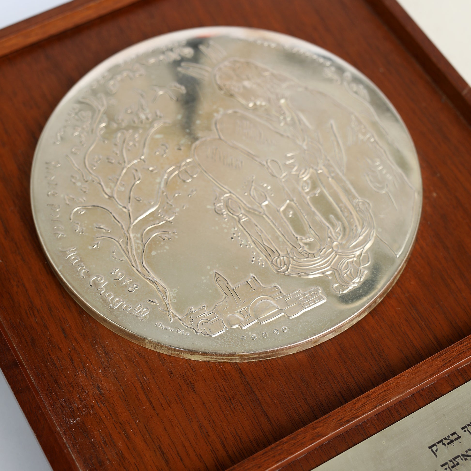 A medal designed by Marc Chagall for the Israeli government in 1979. Marc Chagall, one of the most known Jewish artists, has depicted in this medal Moses holding the Tablets, looking over the city of Jerusalem. The title "לאור הגויים" in Hebrew ("Light unto the nations"), is a term originated from the prophet Isaiah inspiring for a world where the light of God is represented in his people, leading spiritually and morally the entire world. The medals were created by the Israeli Government Company for coins (Sterling silver) and is a part of a limited edition.