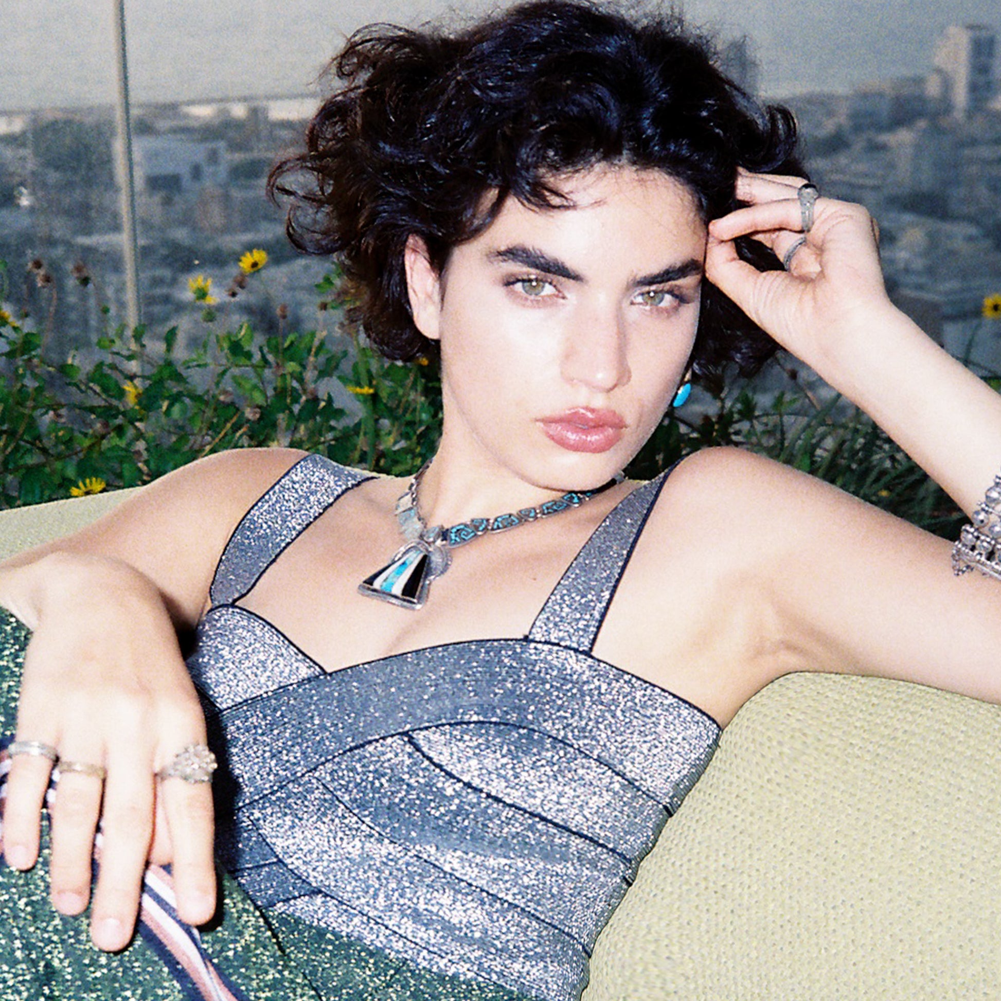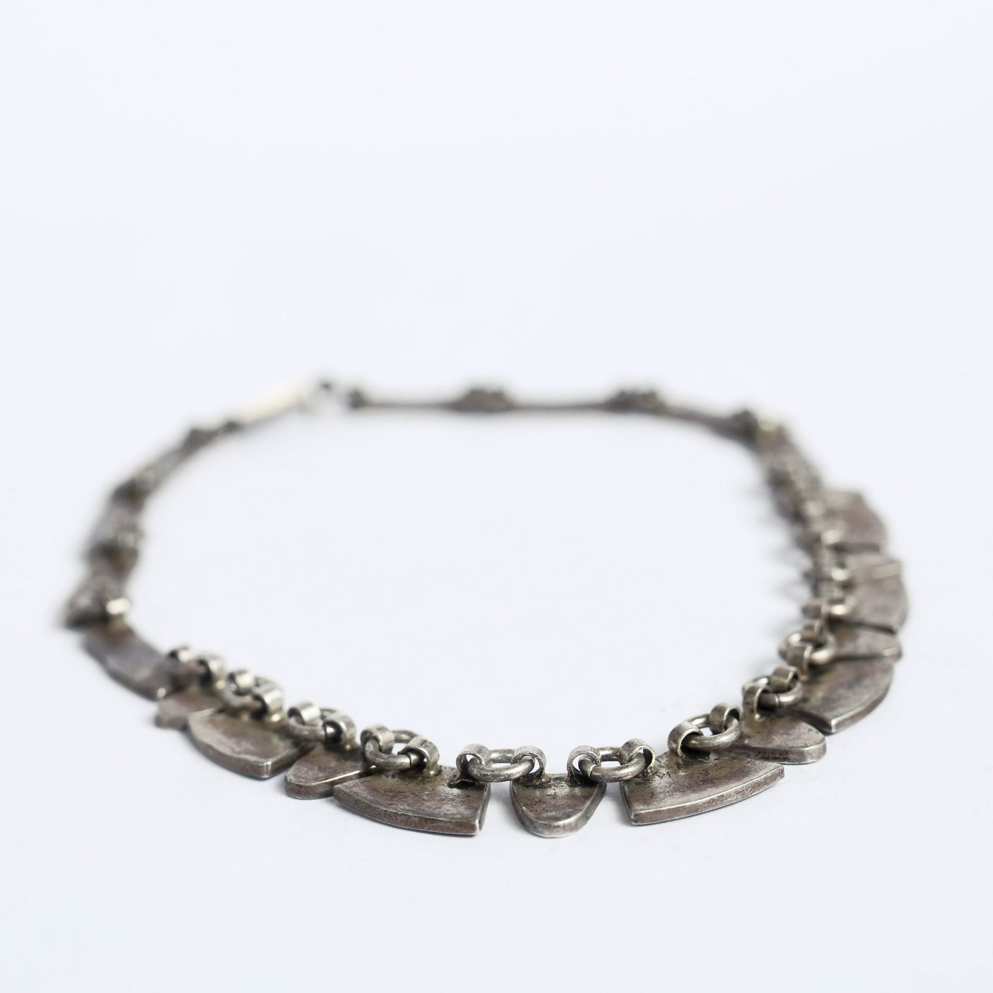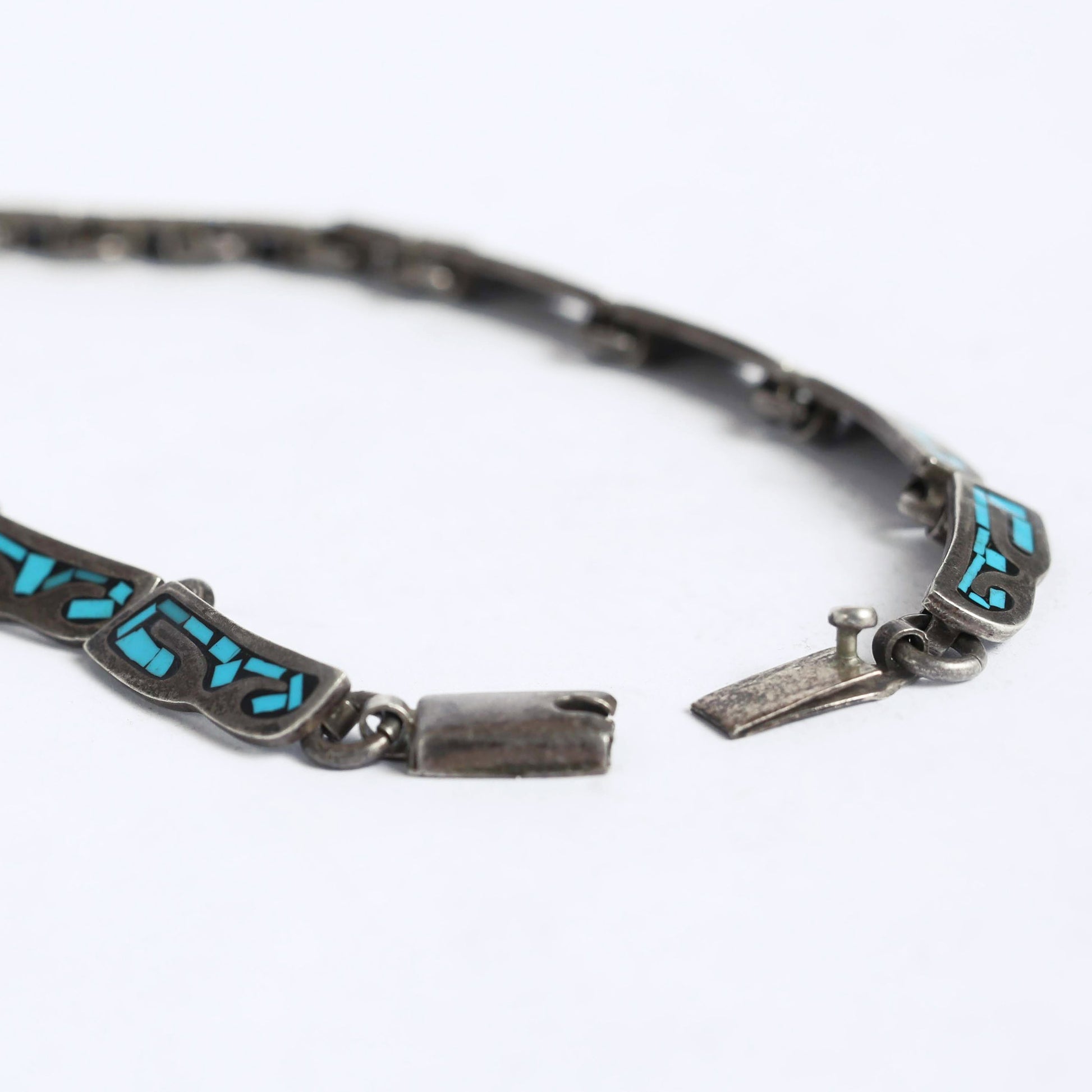 This silver and turquoise collar necklace was made in Mexico, and its design draws inspiration from tribes such as the Navajo, that used this particular gemstone and precious metal in their jewelry. Silver, a resistant and majestic metal and turquoise, with its celestial colour, symbolises in many native cultures the connection between the sky and the earth.