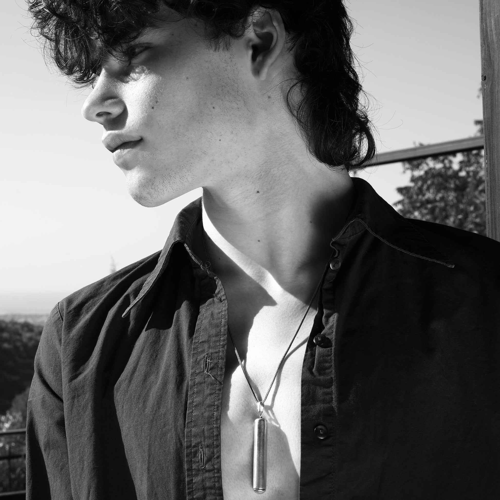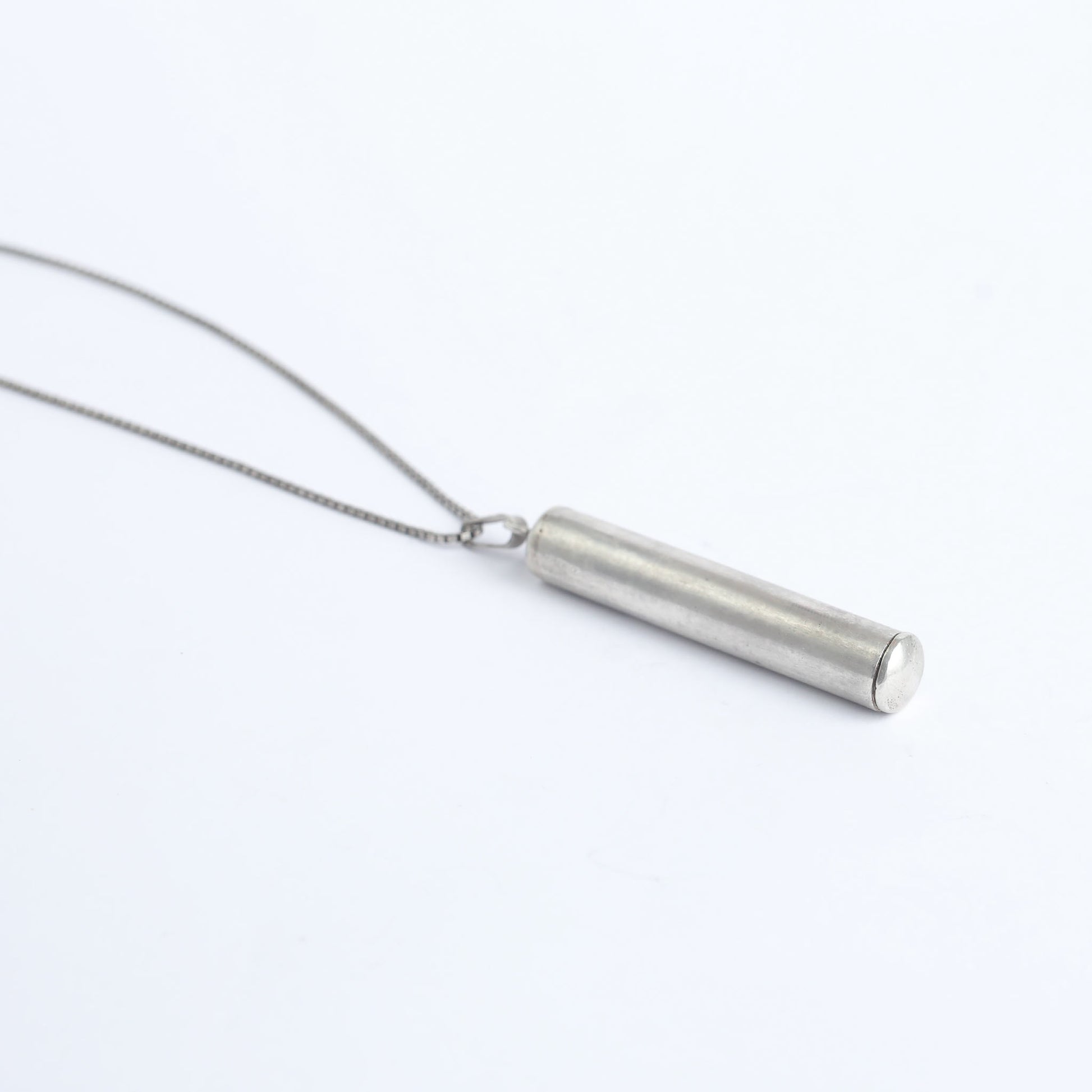 A pendant in the shape of a "mezuza" i common among Jewish people around the world as a jewelry worn for protection. It is as if they are carrying the blessing found in the mezuza, that is the traditional protection of Jewish homes since biblical times. This is a more modern and neat design, made of silver, with an opening at the bottom allowing the insertion of the amulet or the mezuza card.