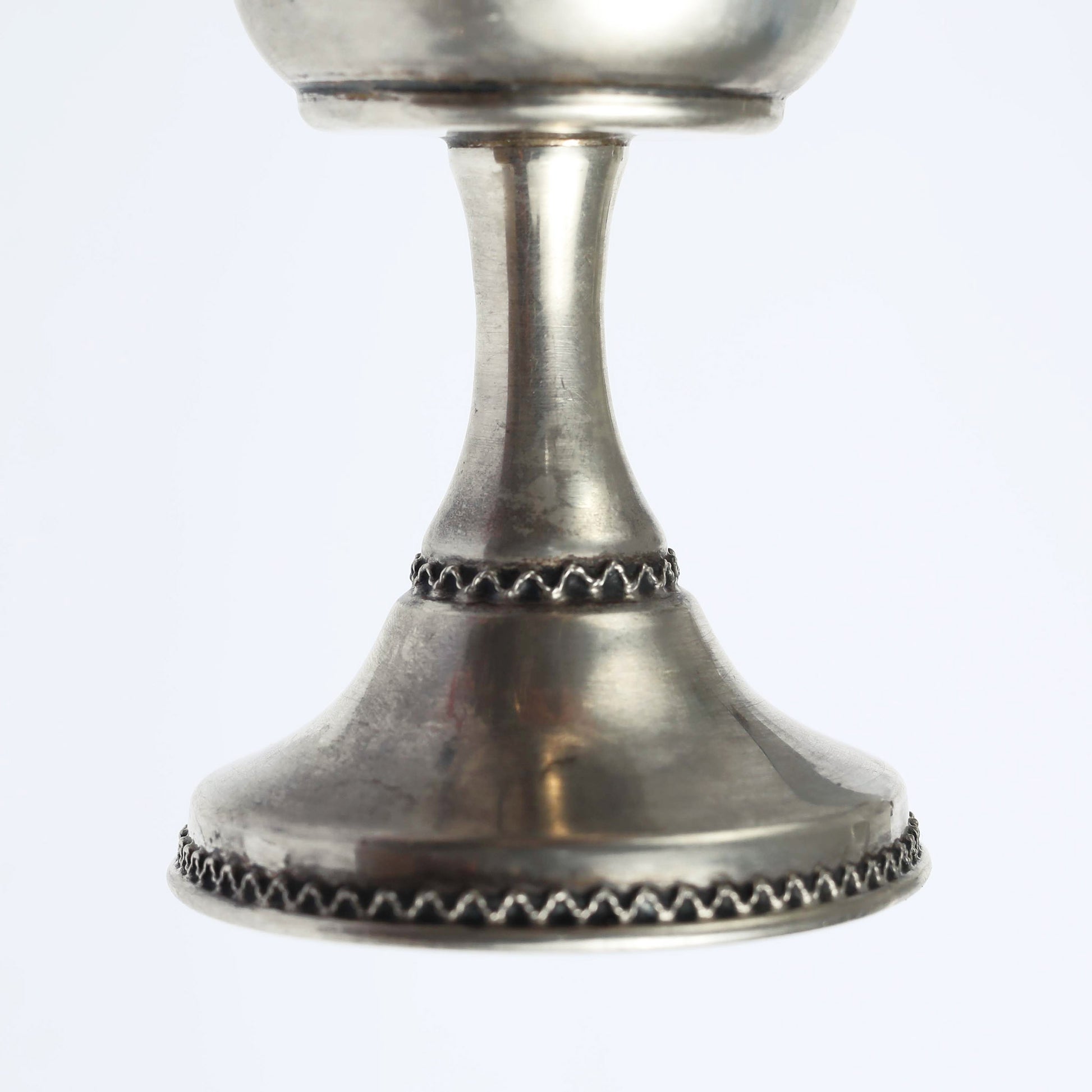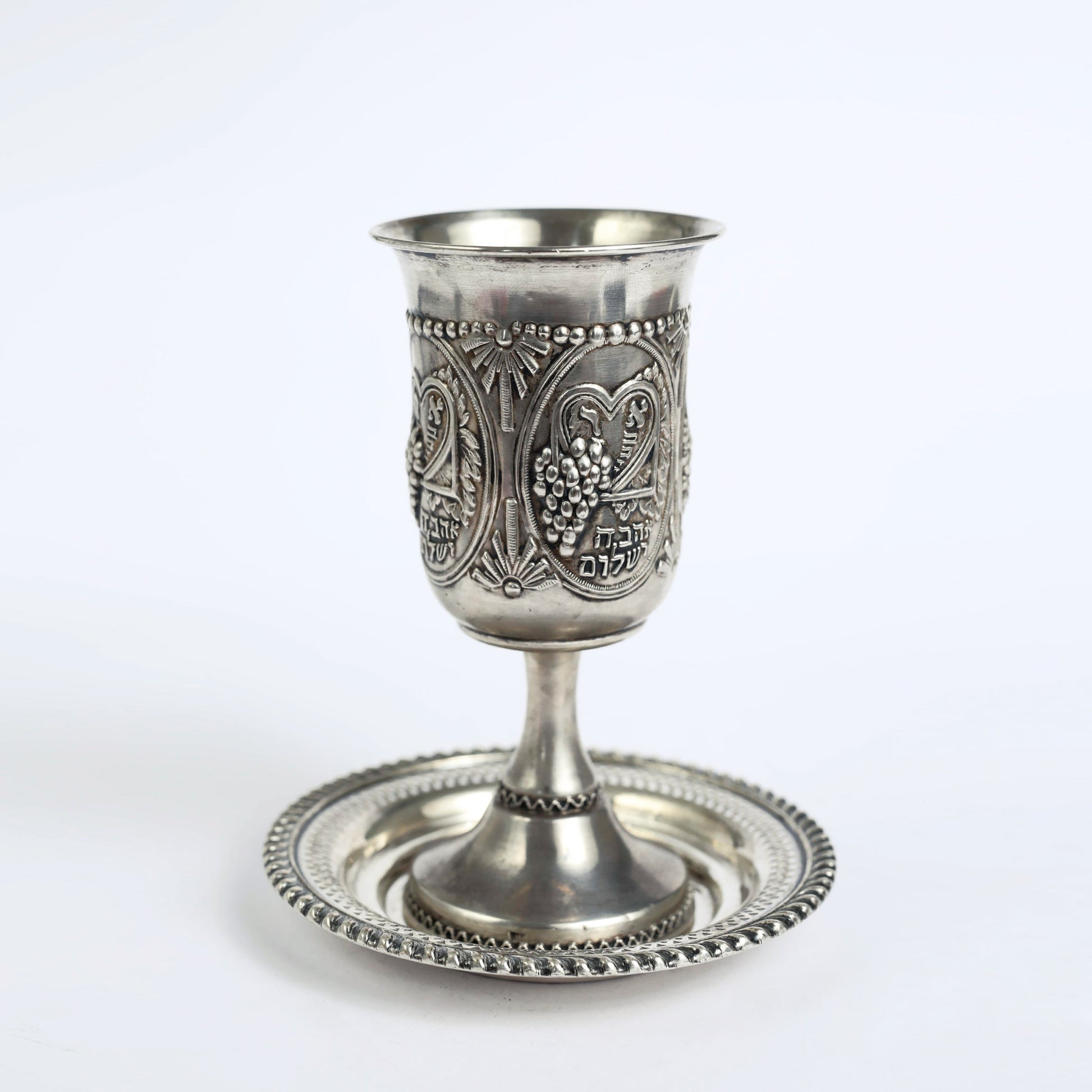 A classic Israeli design of a Kiddush cup, the cup used to bless the wine during the Shabbat. Made of Sterling silver, decorated with grapevines, rays of light, and the Hebrew writings says "love and peace" and "dedicates to the holly Saturday".
