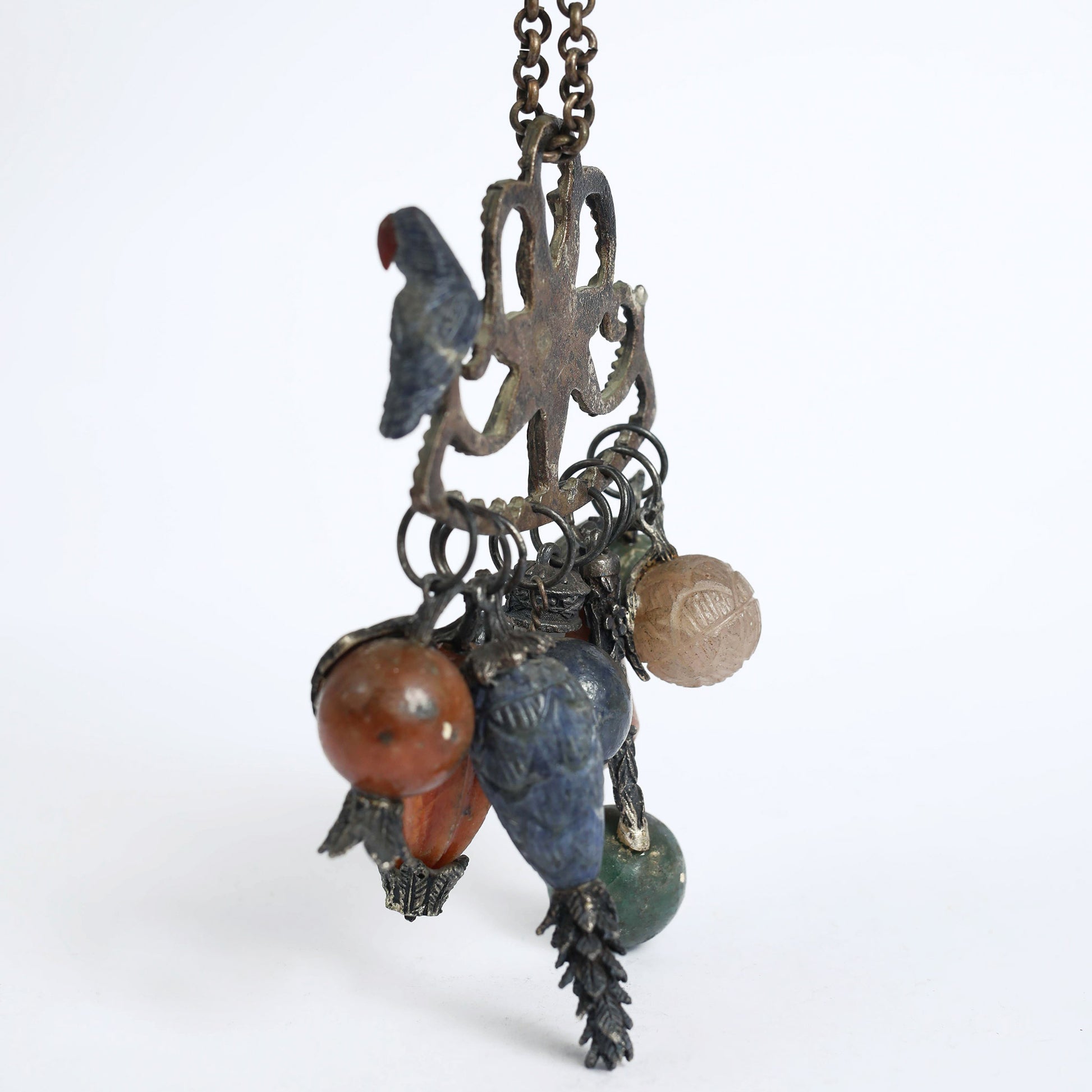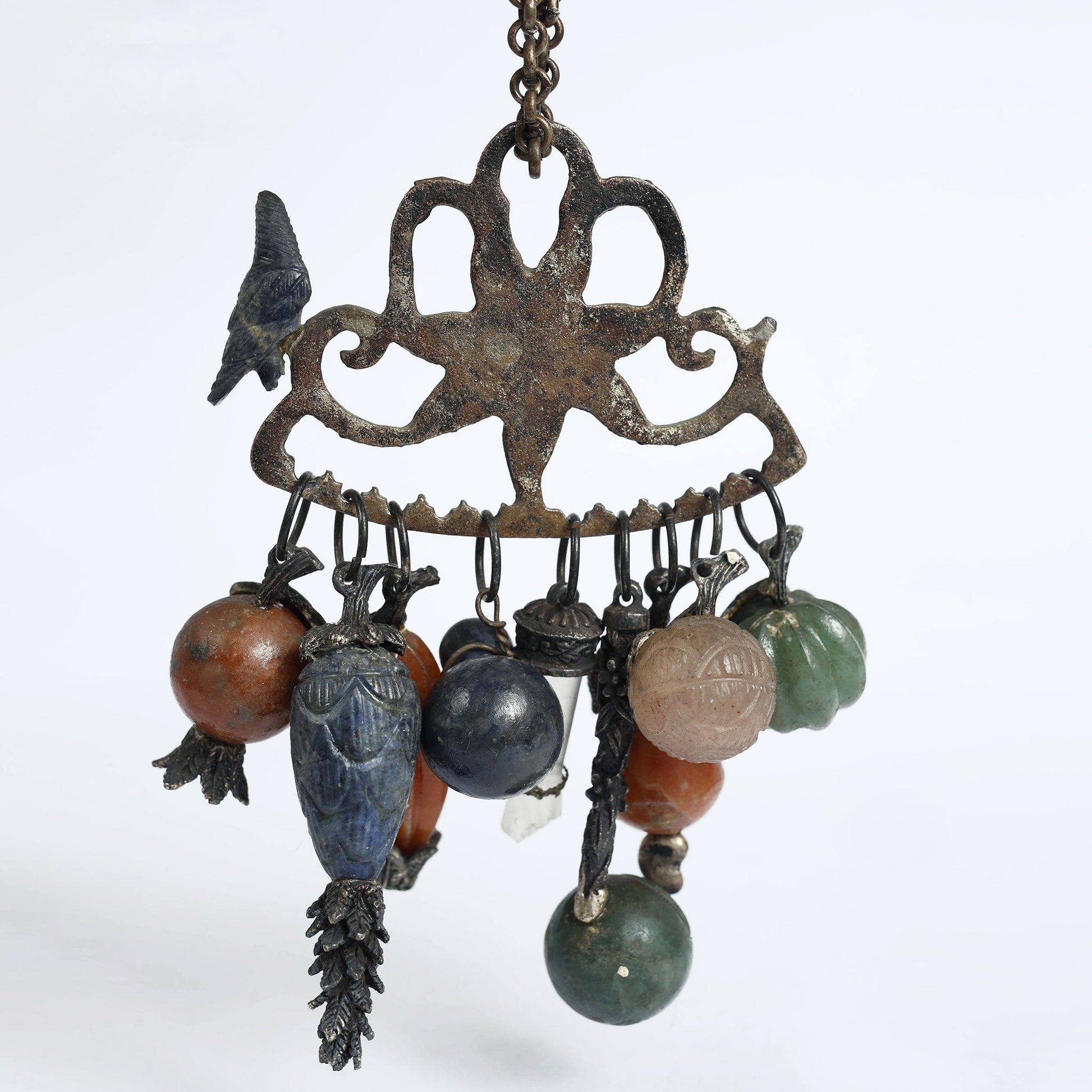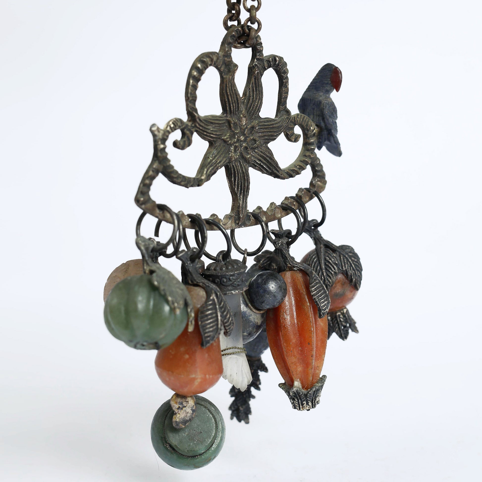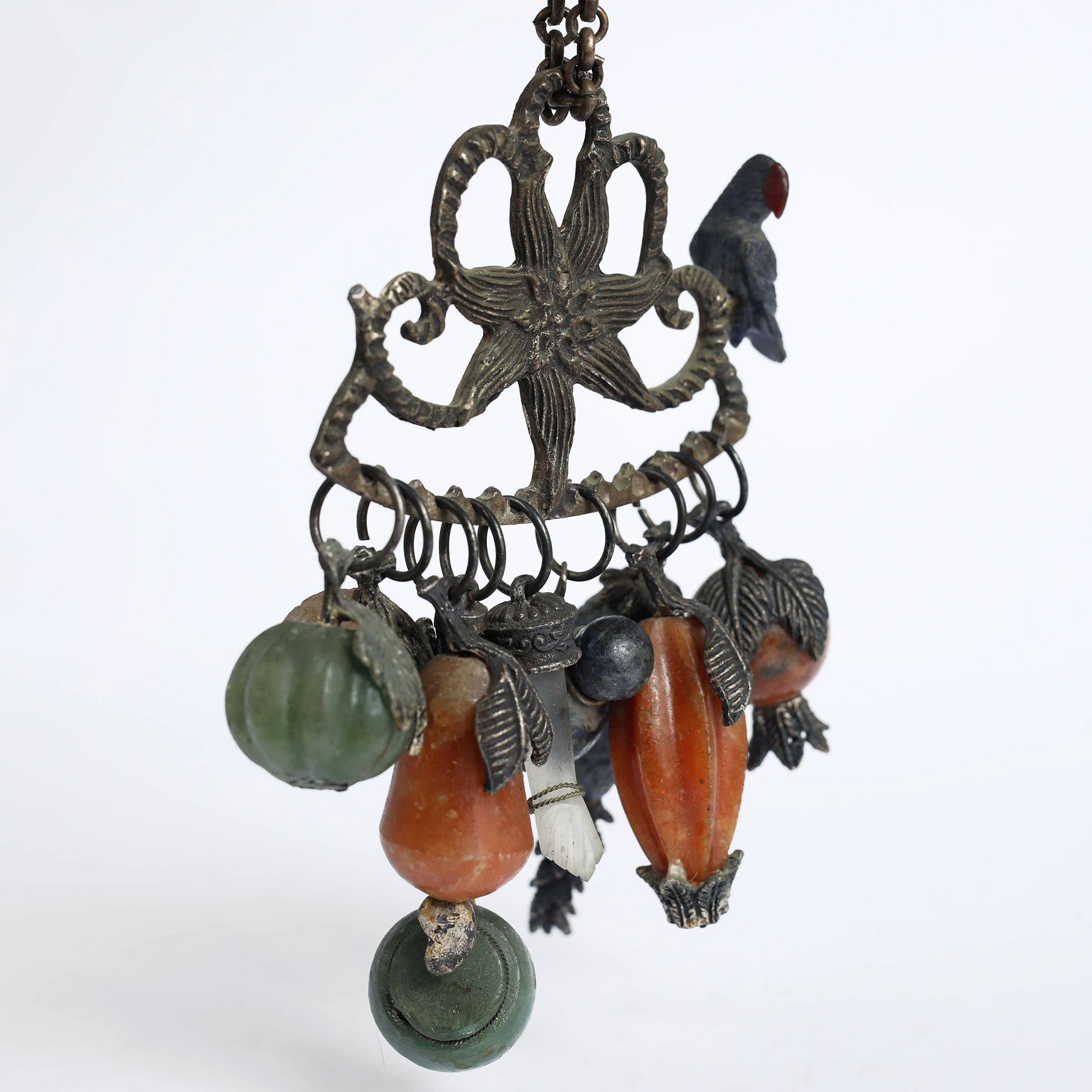 "Penca de Balangadan" is the name of amulets of the Afro- Brazilian tradition, originating in the Bahia coast. It is an amulet protecting from evil spirits and inviting health into ones life. The charms, shaped as fruits and vegetables, are symbols signifying fertility, well-being, good fortune, happiness, longevity, or are linked to protective deities (orixás) in the Afro-Brazilian faith. This Penca is made of silver and various semi- precious stones.