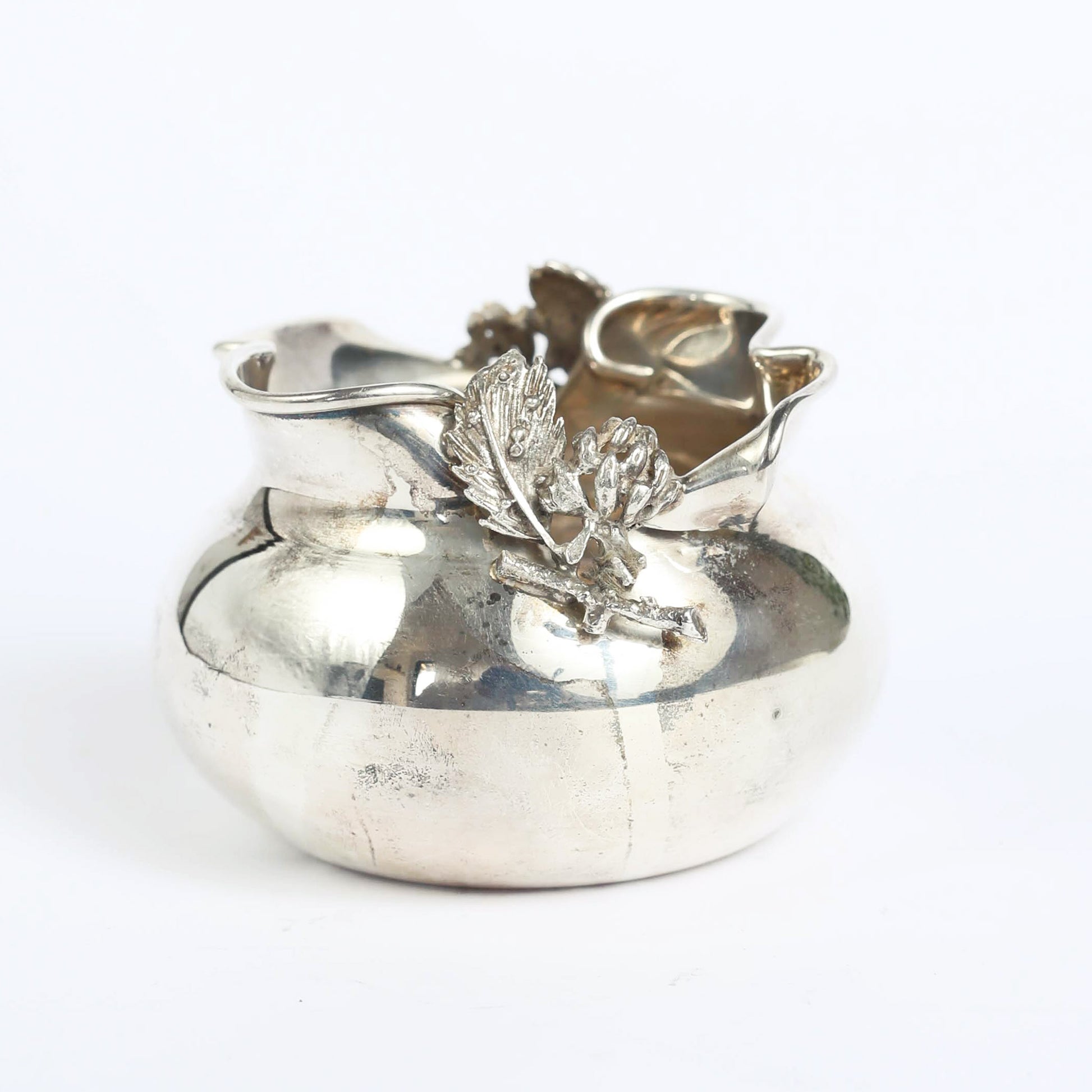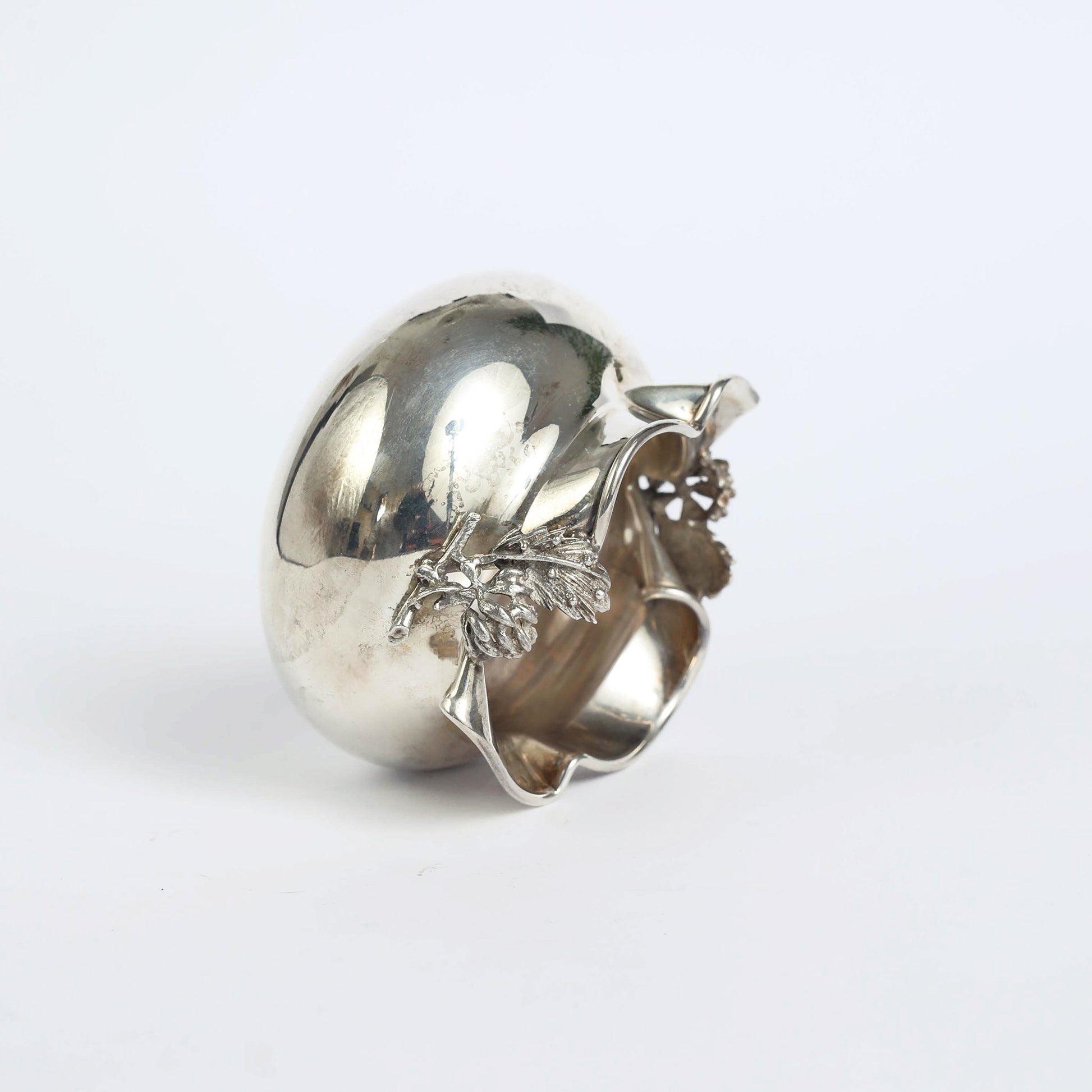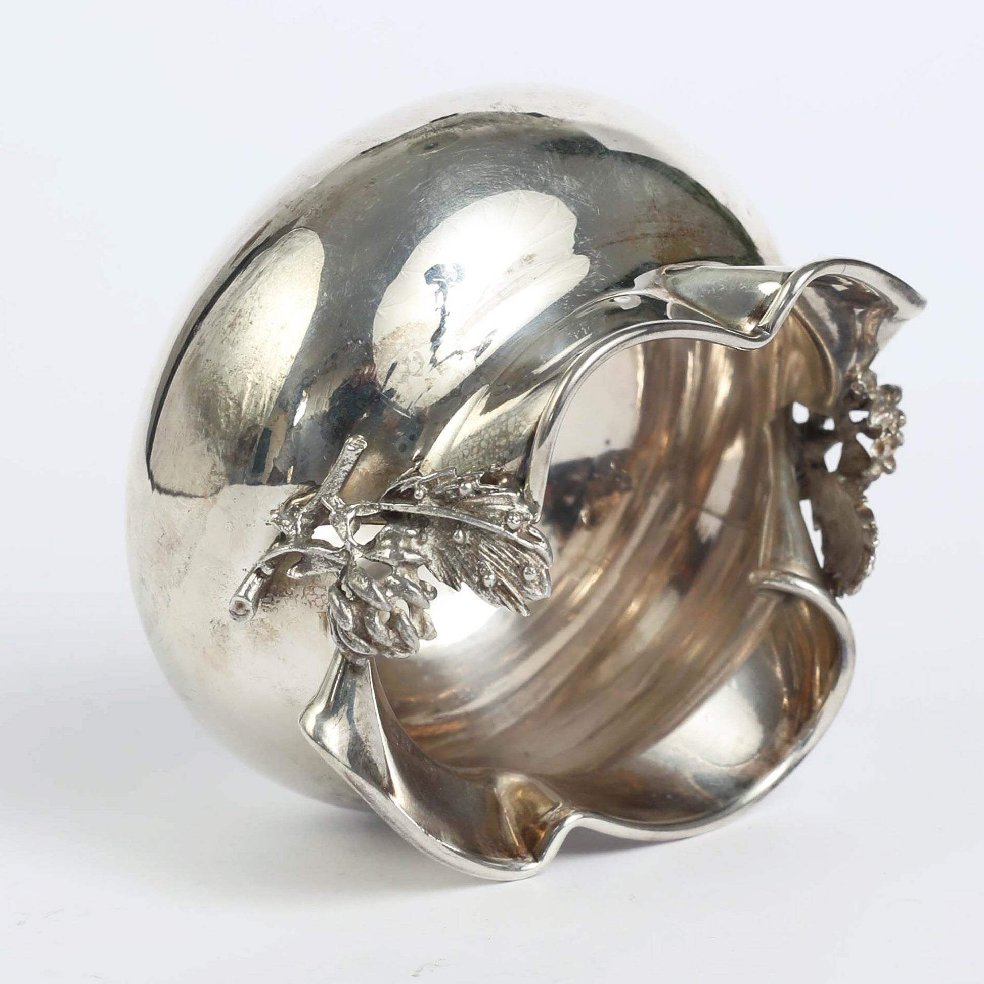 A vessel in the shape of a pomgranate made by the "Hazorfim", an Israeli silversmith family business, established in Israel in the 1950's. The piece has the original signature on the bottom. Pomegranates play an important role as a symbol of righteousness in Judaism, as they supposedly contain 613 seeds, which correspond to the 613 commandments of the Torah.