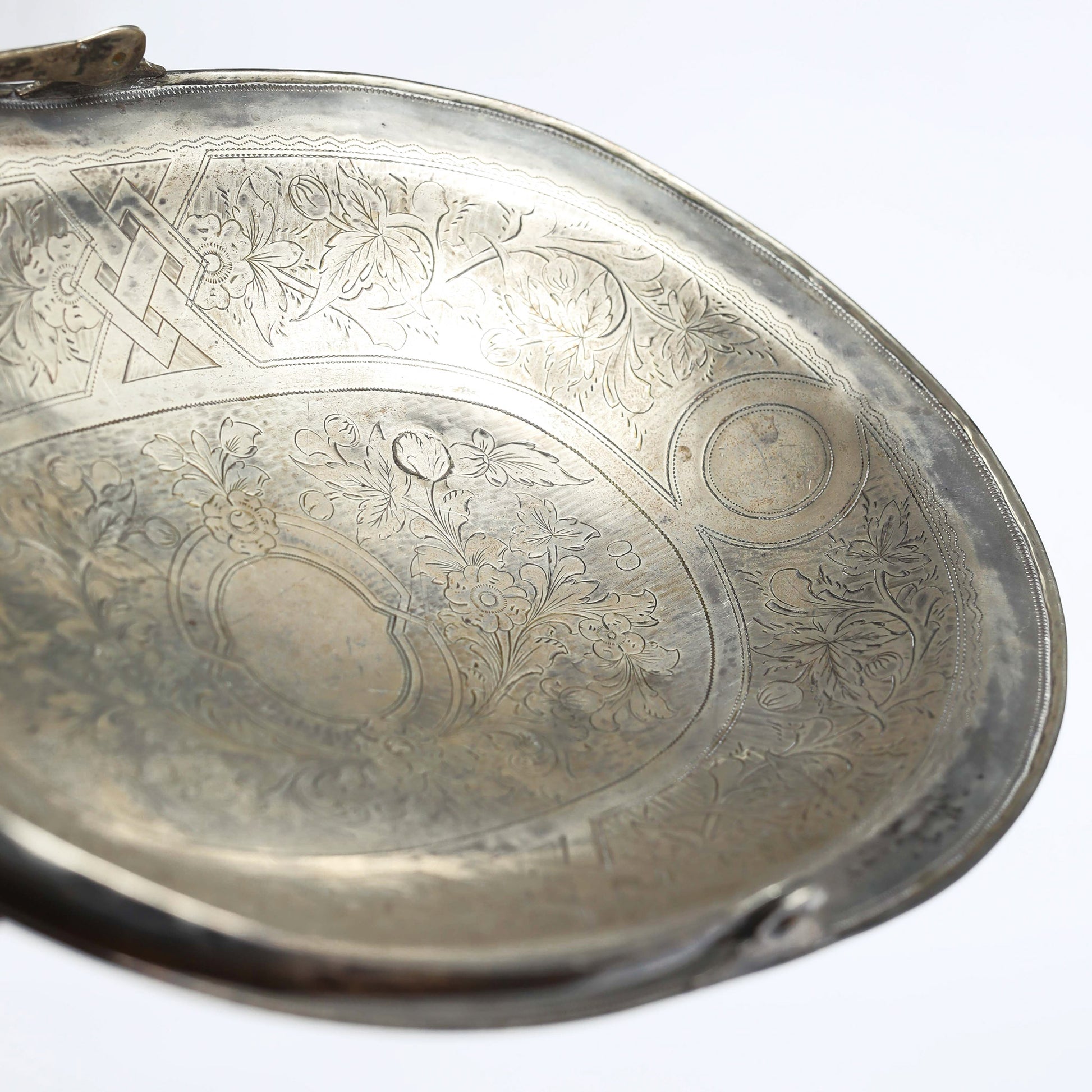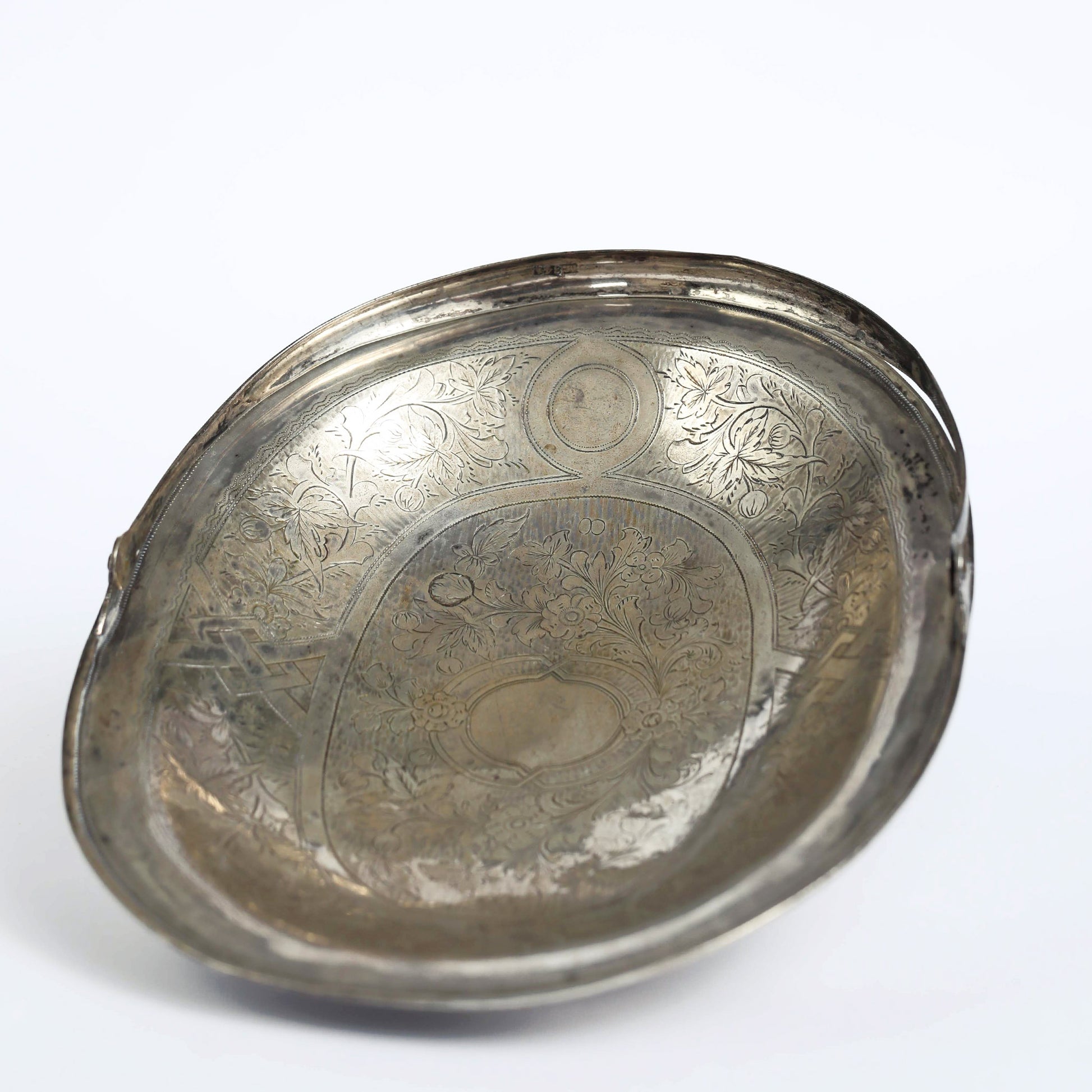 A handmade, delicate silversmith work made in Tzar Russia. The plate has the engraving of the number 84, a historical indicator of silver purity during the Russian Tzar period, a practice dating back to 1798. In that era, the unit of measurement for purity was known as "Zolotniki," and a mark of 84 represented the "Silver Standard Mark," signifying that the silver contained 84 or more Zolotniki of purity.