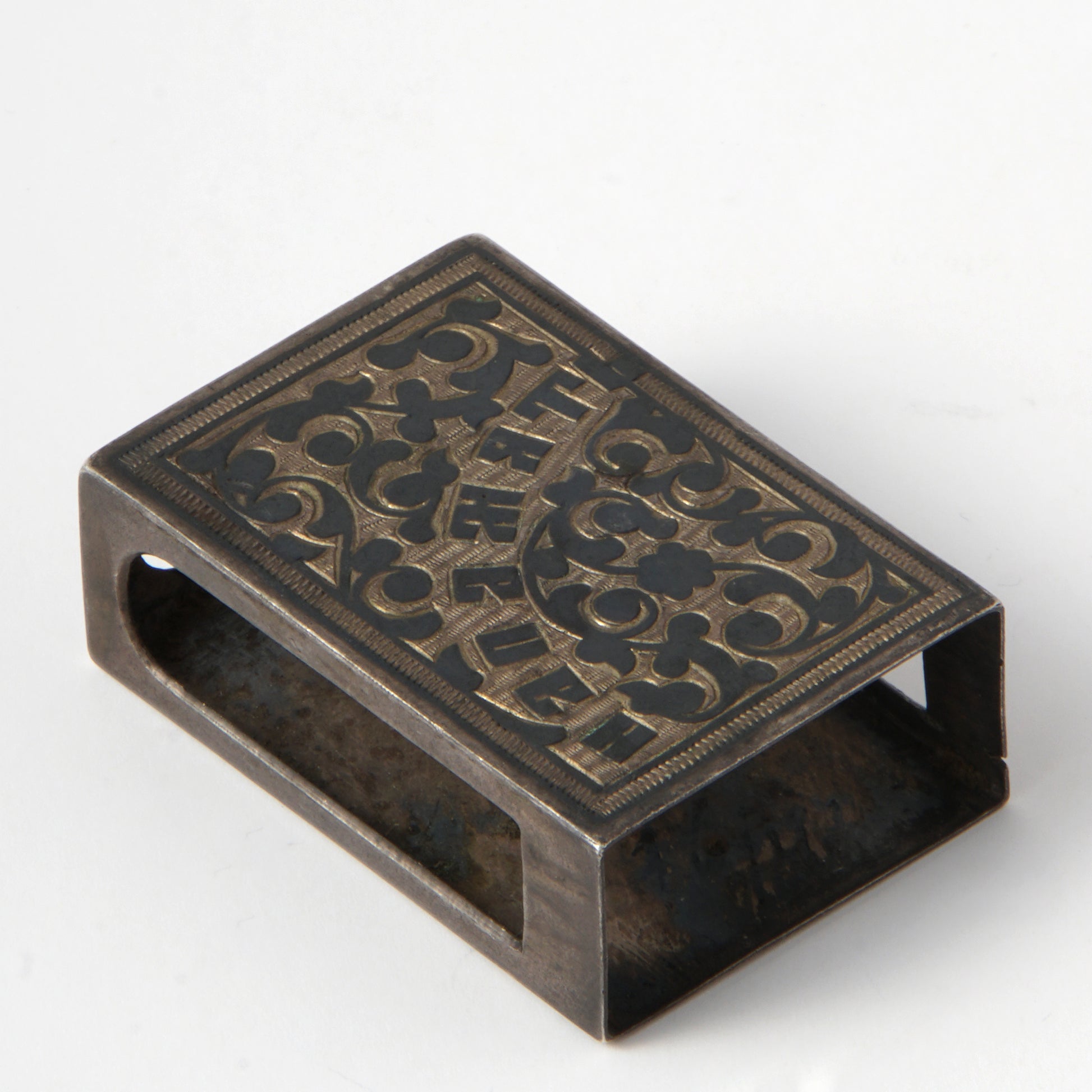 This is a Sterling silver match box (called also vesta box) made in Russia. the writing says "a souvenir" in Russian.