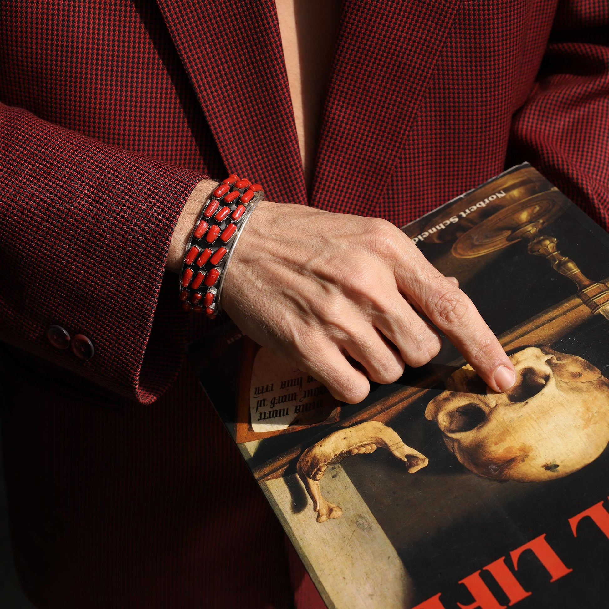 a beautiful 924 silver bracelet from Pushkar, Rajasthan, India. This stunning piece is handcrafted by skilled local artisans and features a unique combination of red coral stones, known for their rich color and natural beauty. The silver used in this bracelet is 924 silver, guaranteeing its authenticity and quality. Each red coral stone is genuine and has not been dyed, making this bracelet a truly one-of-a-kind piece. Wear it alone or stack it with other bracelets for a bohemian and exotic look.