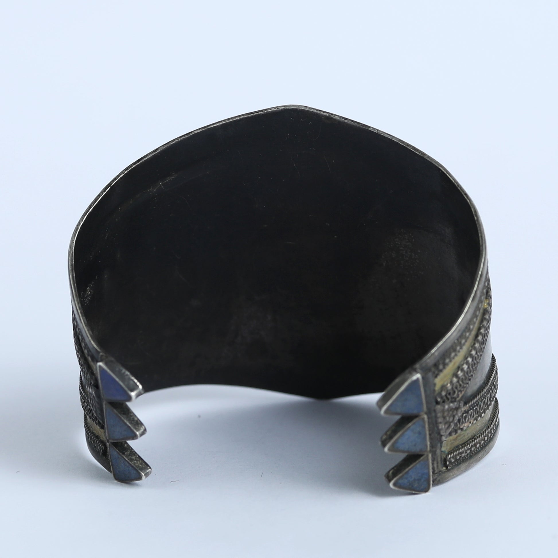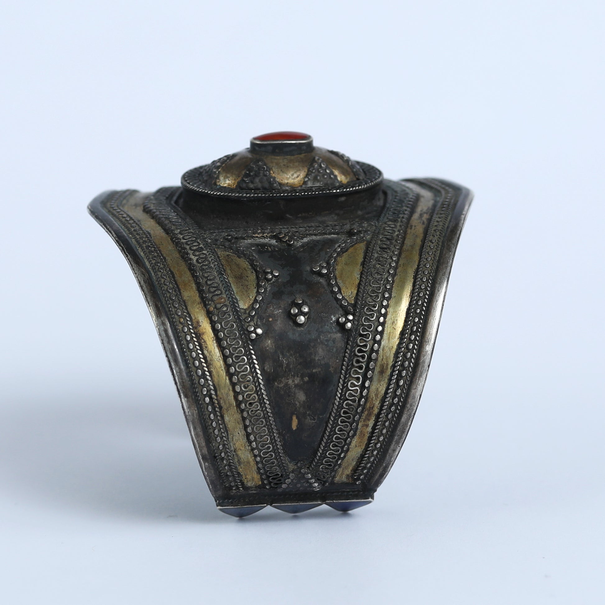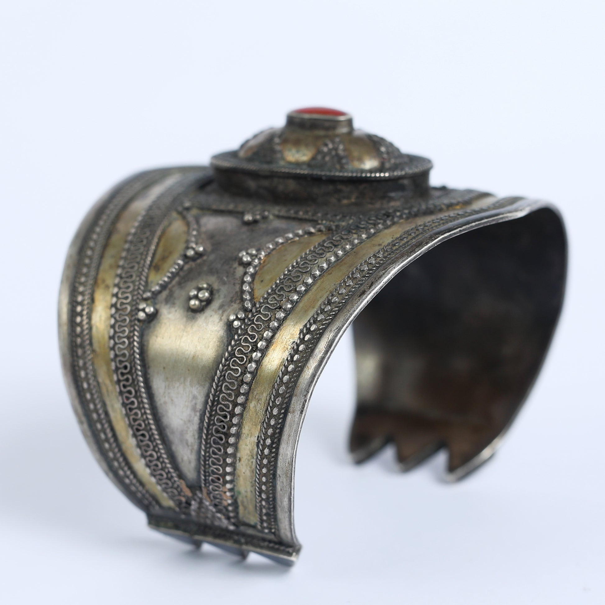 This is a vintage silver cuff bracelet, covered with gold. The gemstone embedded in it is Carnelian stone and the style is Indo- Persian. Carnelian is a semi- precious gemstone, highly valued since the times of Ancient Assyria and Greece and is one of the stones thought to be the Odem, one of the twelve stones found on the Hoshen, the sacred garment worn by the High priest of the Temple of Jerusalem.
