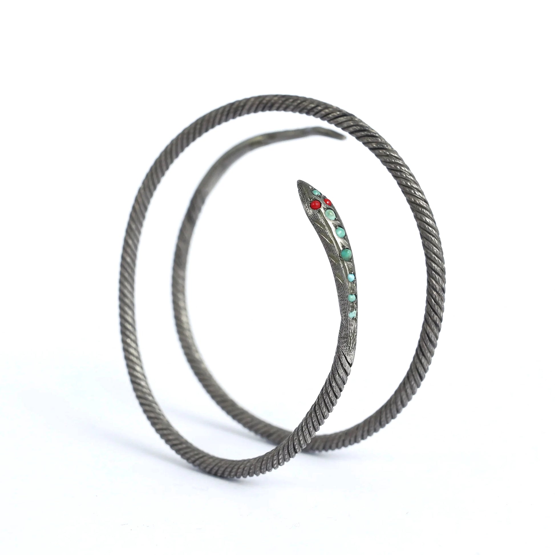 A silver and stones serpent bracelet, probably made in India. Indian mythology is rich with stories inculding serpents. Lord Shiva, who embodies the roles of both destroyer and transformer, is commonly represented with a serpent encircling his neck, symbolising his dominion over destructive forces. The serpent deities, known as Nagas, are revered for their protective qualities and their ability to invite regeneration in life.