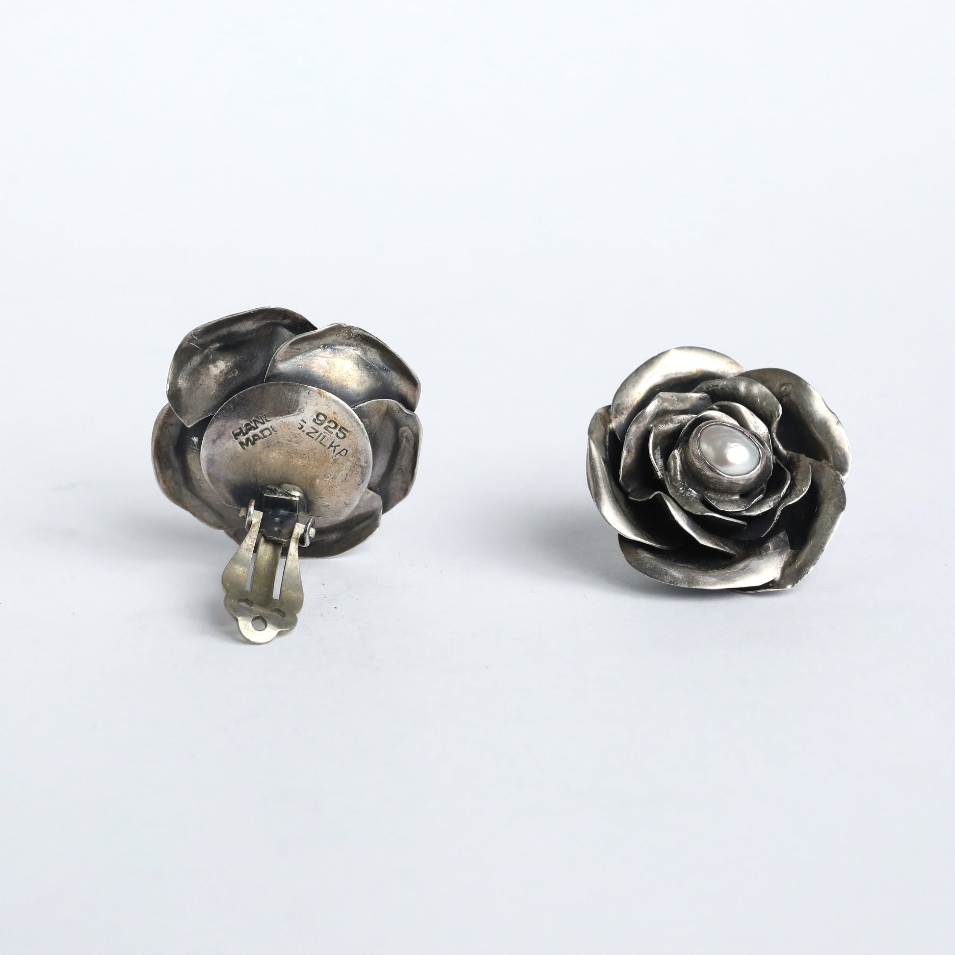 Silver Rose Earrings with Pearl by Israeli Designer S. Zilka