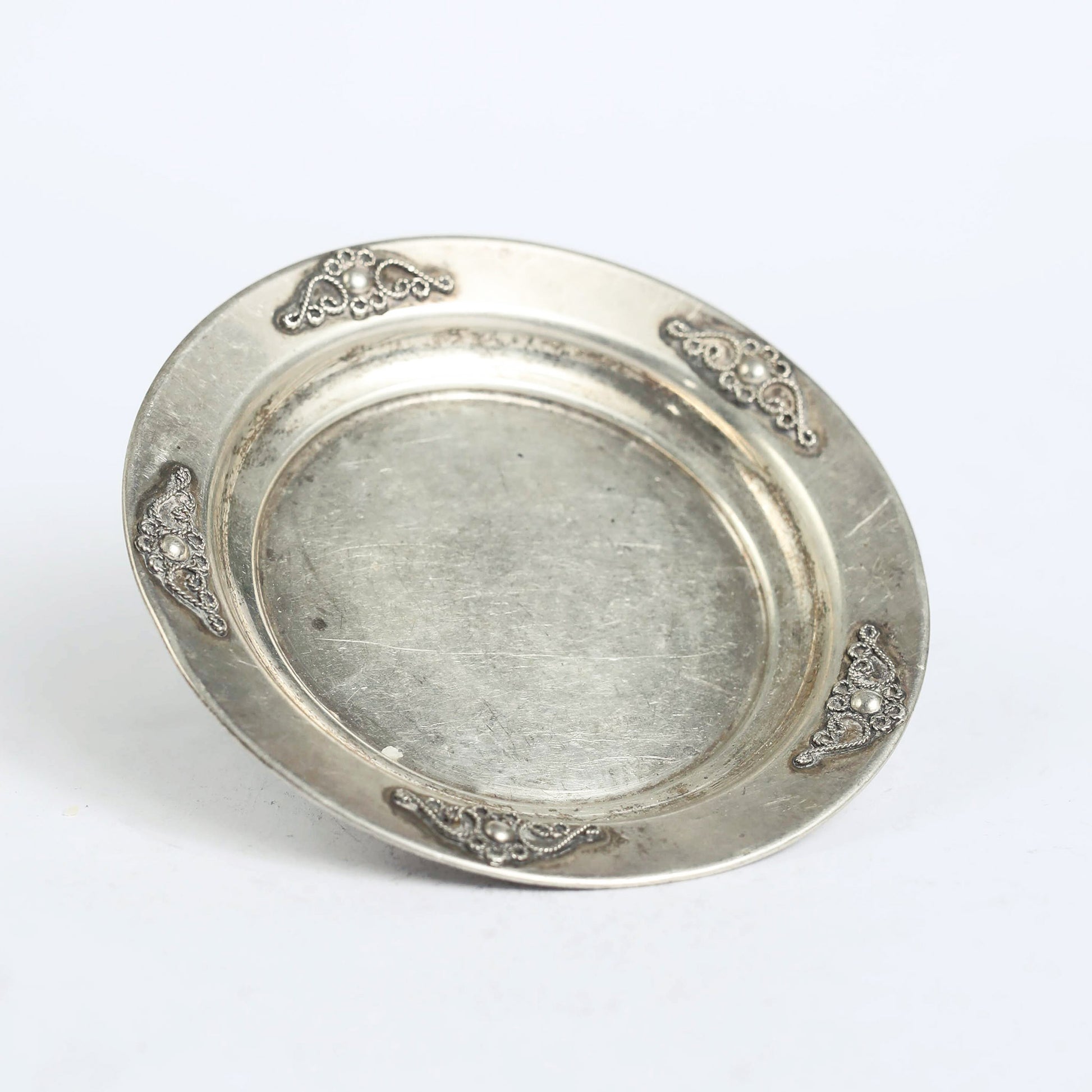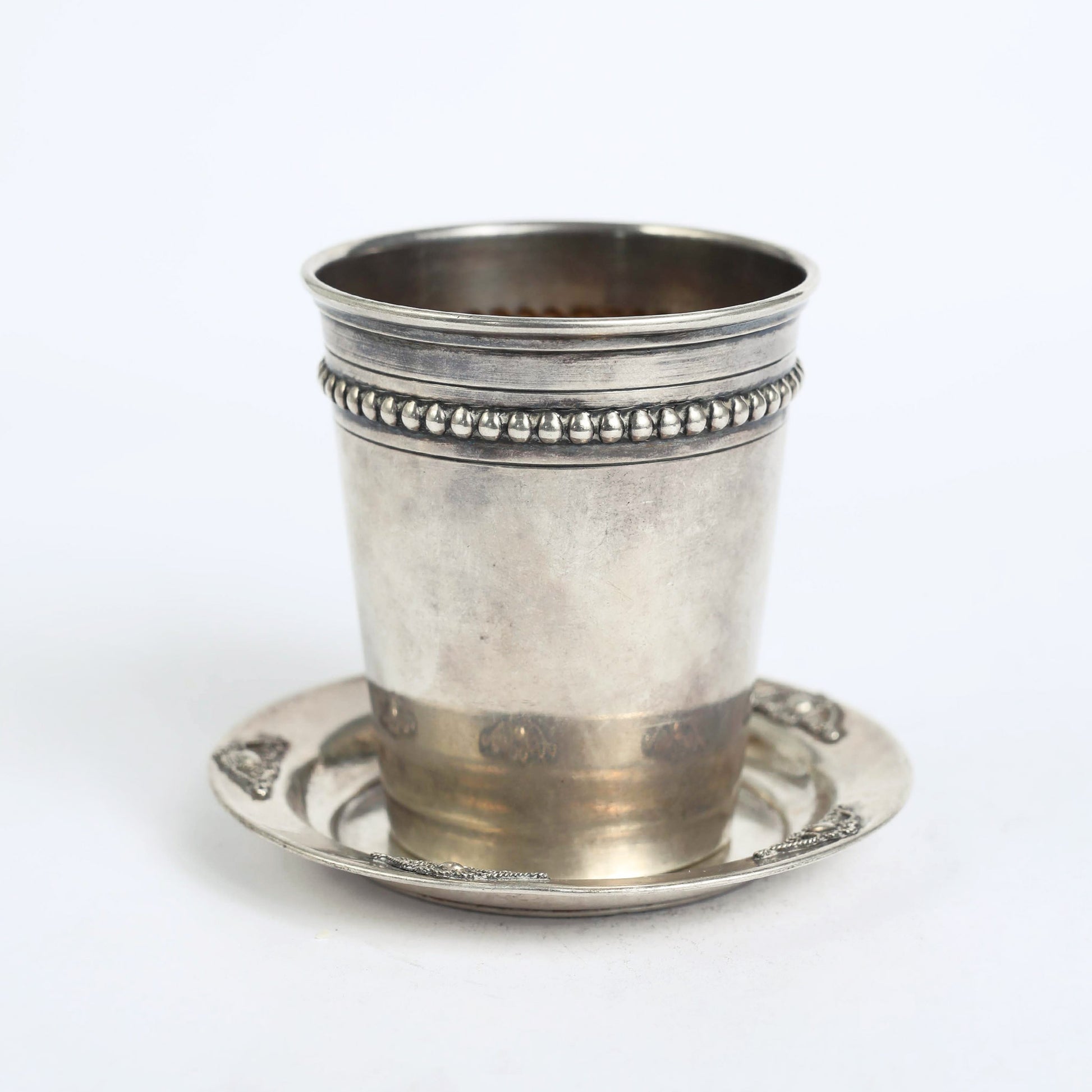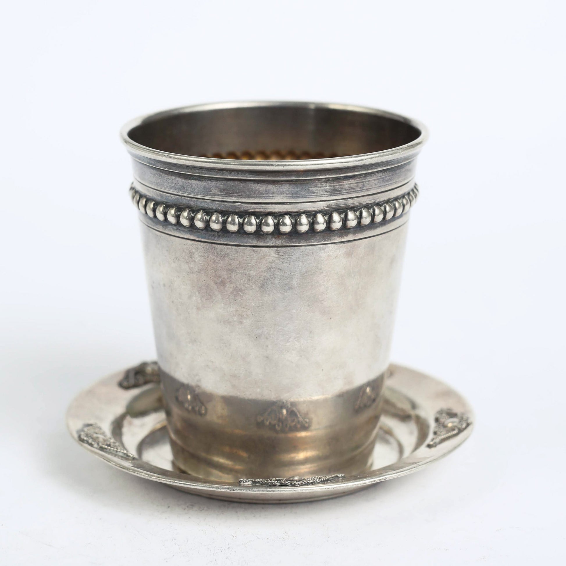 A Kiddush cup used for the blessing of wine during Shabbat dinners and afternoons. Traditionally, this cups are made of silver but could be made of other precious metals, too. This one has its original silver signature by the manufacture. The cup and the saucer are not a set.