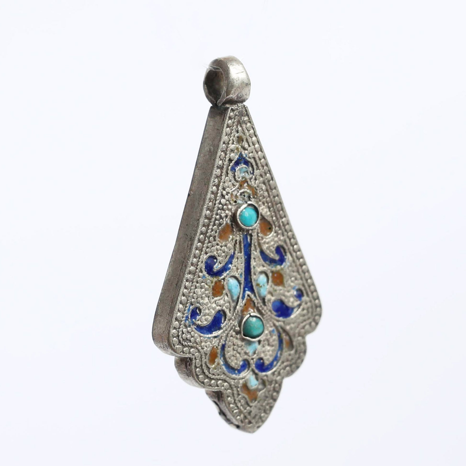 This pendant is brought from the Moroccan Atlas Mountain, home of the Berber tribe. Made of pure silver, a precious metal that was commonly used in the area to make jewelry, is embedded with Lapis Lazuli, Corals, and turquoise gemstones. Lapis, the gemstone of the Pharaohs, and turquoise, the gemstone of the heavens, are delicately put together manually in this piece.