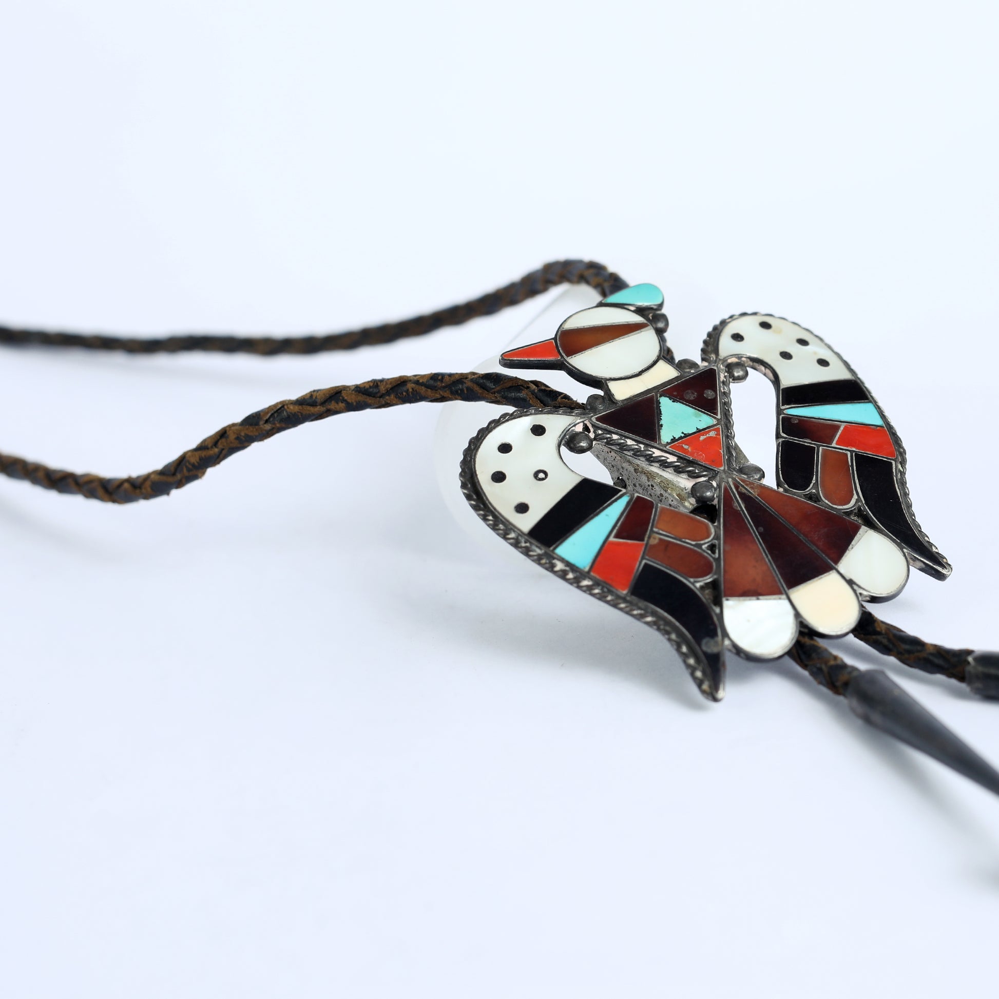 Zuni are Native American Pueblo people from the Zuni River Valley, New Mexico. The Zuni are known for their fine lapidary work: they set hand-cut turquoise and other stones in silver to create intricate designs and unique patterns. In this Necklace, signed by the artist, there are Black Onyx, Turquoise, Corals and Jasper Stone intricated in it. For the Zuni, birds are a symbol of freedom and also link humanity to the divine or supernatural realms.